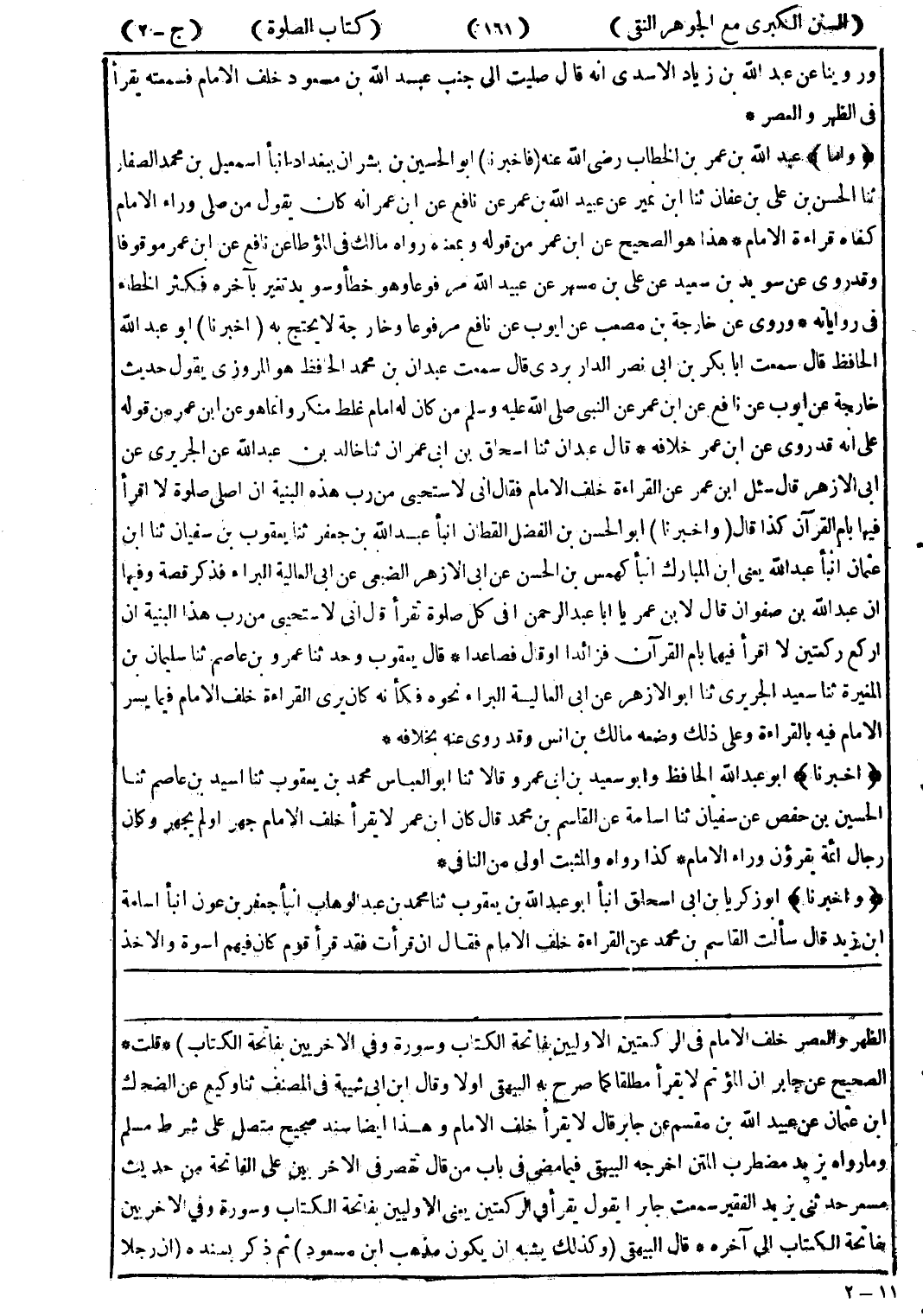 الظهر والعصر خلف الامام في الركعتين الاوليين بفاتحة الكتاب وسورة وفي الاخريين بفاتحة الكتاب) * قلت * الصحيح عن جابر ان المؤتم لا يقرأ مطلقا كما صرح به البيهقى اولا وقال ابن ابى شيبة في المصنف ثنا وكيع عن الضحاك ابن عثمان عن عبيد الله بن مقسم عن جابر قال لا يقرأ خلف الامام وهذا ايضا سند صحيح متصل على شرط مسلم وما رواه يزيد مضطرب المتن اخرجه البيهقى فيما مضى في باب من قال تقصر في الاخر بين على الفاتحة من حديث مسعر حدثنى يزيد الفقير سمعت جابرا يقول يقرأ في الركعتين يعنى الاوليين بفاتحة الكتاب وسورة وفي الاخريين بفاتحة الكتاب إلى آخره * قال البيهقى (وكذلك يشبه ان يكون مذهب ابن مسعود) ثم ذكر بسنده (ان رجلا