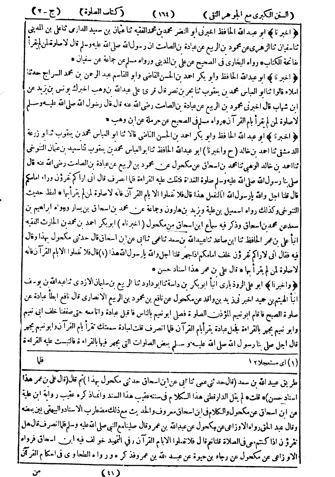 طريق عبيد الله بن سعد (قال حدثنى عمى ثنا ابى عن ابن اسحاق حدثنى مكحول بهذا) ثم قال (قال على بن عمر هذا اسناد حسن) * قلت * لم يقل الدارقطني هذا الكلام في سننه عقيب هذا السند وانما ذكره عقيب رواية ابن علية عن ابن اسحاق عن مكحول والكلام في ابن اسحاق معروف والحديث مع ذلك مضطرب الاسناد والبيهقي بين بعضه وقال عبد الحق رواه الاوزاعي عن مكحول عن عبد الله بن عمر وقال صلينا مع النبي صلى الله عليه وسلم فلما انصرف قال هل تقرؤن إذا كنتم معى في الصلاة قلنا نعم قال فلا تفعلوا الا بام القرآن وفي التمهيد خولف فيه ابن اسحاق فرواه الاوزاعي عن مكحول عن رجاء بن حيوة عن عبد الله بن عمرو فذكره ورواه الطحاوي في احكام القرآن