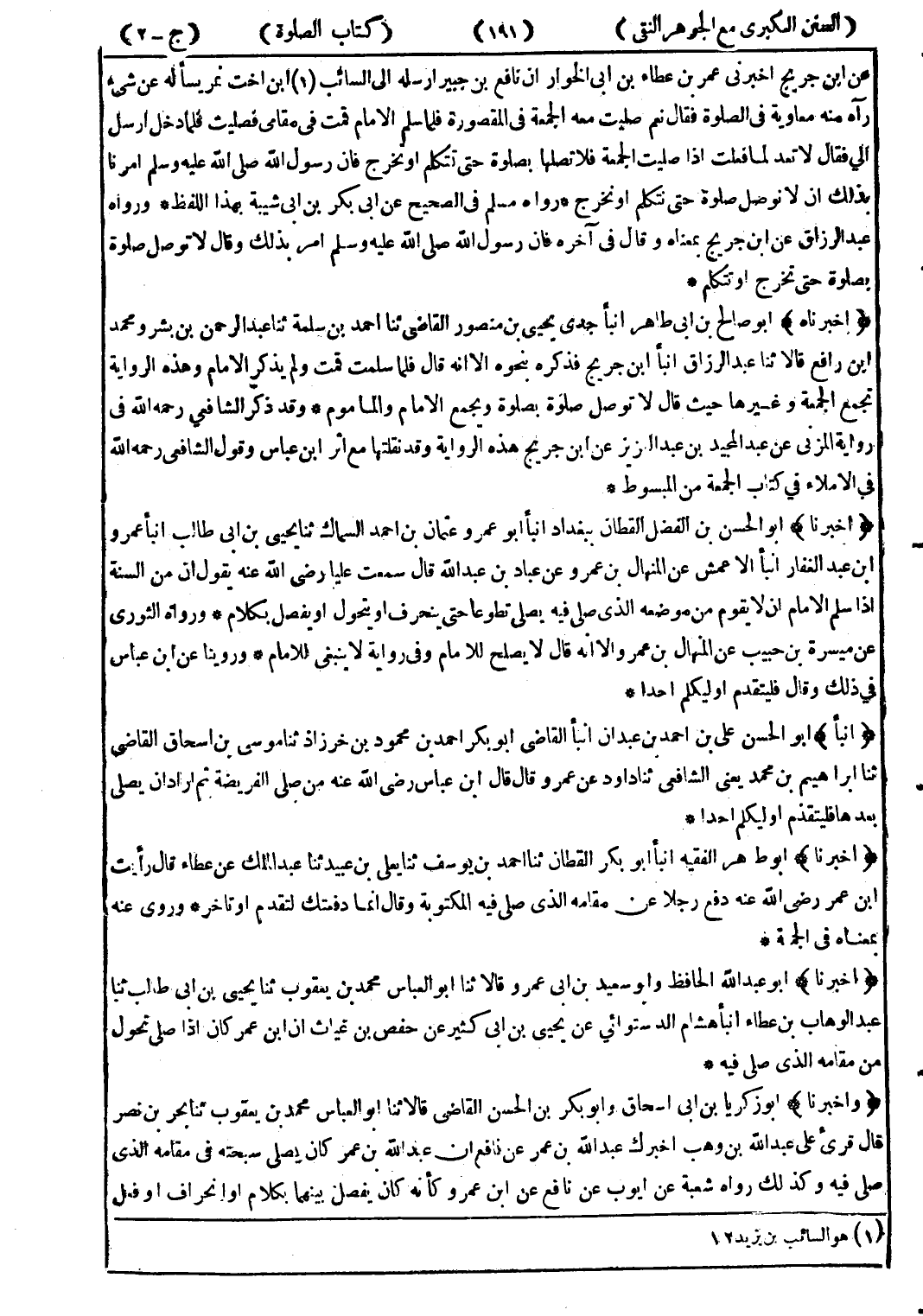 (وأخبرنا) أبو زكريا بن ابى اسحاق وابو بكر بن الحسن القاضى قالا ثنا أبو العباس محمد بن يعقوب ثنا بحر بن نصر قال قرئ على عبد الله بن وهب اخبرك عبد الله بن عمر عن نافع ان عبد الله بن عمر كان يصلى سبحته في مقامه الذى صلى فيه وكذلك رواه شعبة عن ايوب عن نافع عن ابن عمرو كأنه كان يفصل بينهما بكلام أو انحراف أو فعل