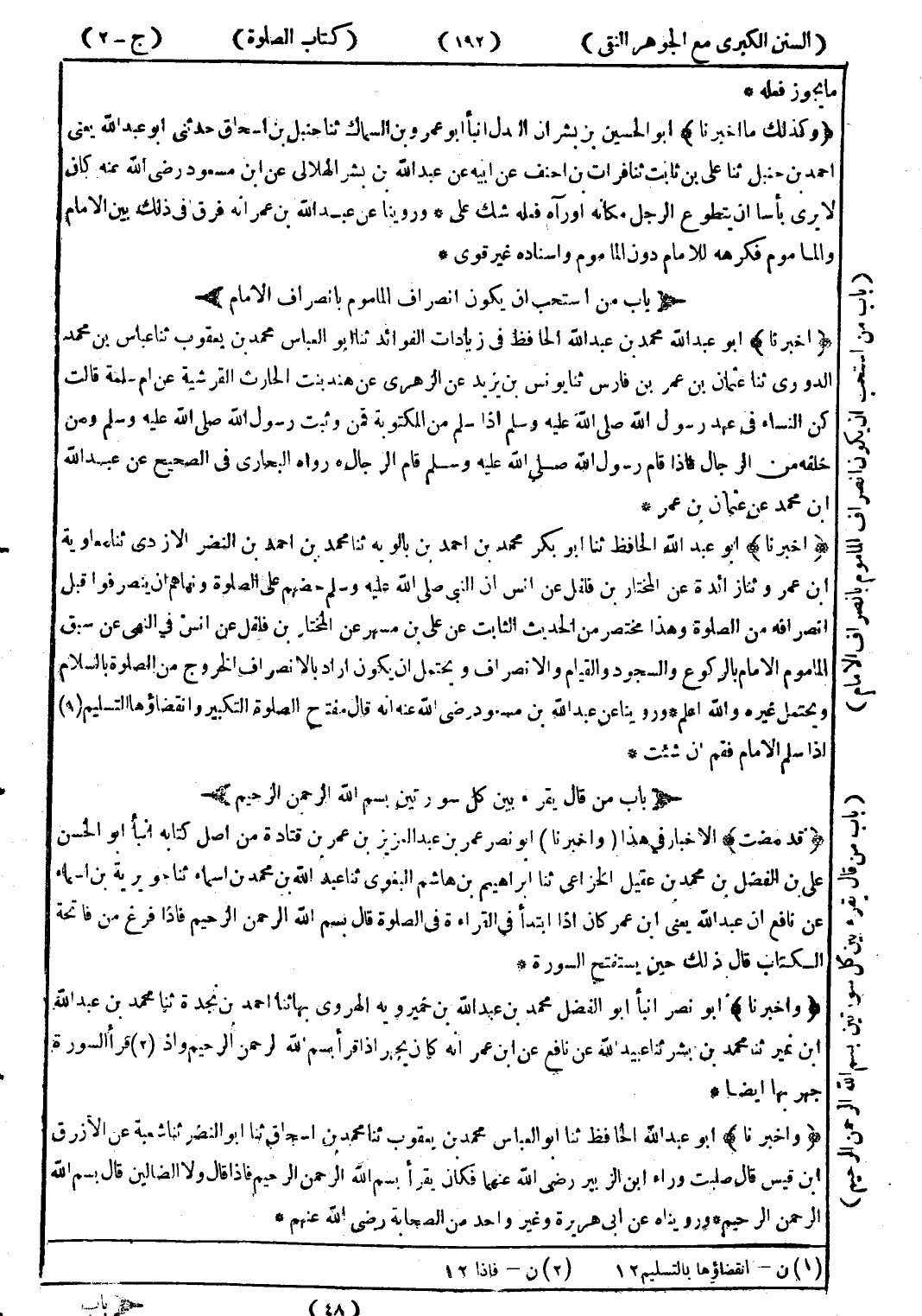 (وأخبرنا) أبو نصر عمر بن عبد العزيز بن عمر بن قتادة من اصل كتابه انبأ أبو الحسن على بن الفضل بن محمد بن عقيل الخزاعى ثنا ابراهيم بن هاشم البغوي ثنا عبد الله بن محمد بن اسماء ثنا جويرية بن اسماء عن نافع ان عبد الله يعنى ابن عمر كان إذا ابتدأ في القراءة في الصلوة قال بسم الله الرحمن الرحيم فإذا فرغ من فاتحة الكتاب قال ذلك حين يستفتح السورة *