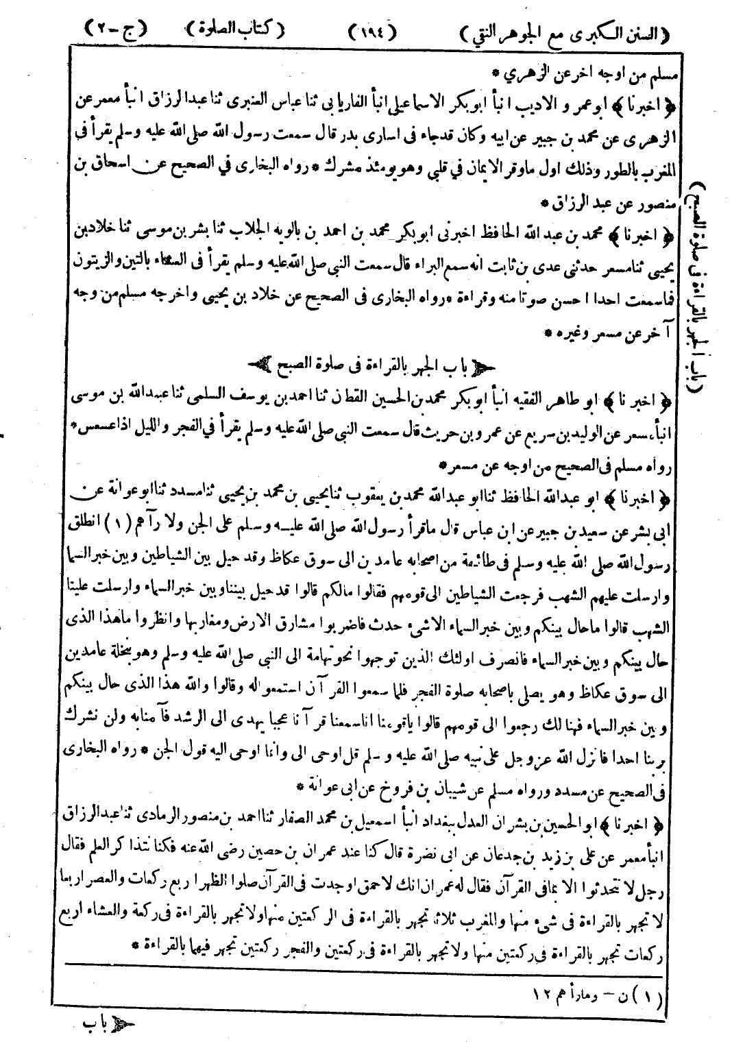 (أخبرنا) أبو الحسين بن بشران العدل ببغداد انبأ اسمعيل بن محمد الصفار ثنا احمد بن منصور الرمادي ثنا عبد الرزاق انبأ معمر عن على بن زيد بن جدعان عن ابى نضرة قال كنا عند عمران بن حصين رضى الله عنه فكنا نتذاكر العلم فقال رجل لا تتحدثوا الا بما في القرآن فقال له عمران انك لا حمق أو جدت في القرآن صلوا الظهر اربع ركعات والعصر اربعا لا تجهر بالقراءة في شئ منها والمغرب ثلاثا تجهر بالقراءة في الركعتين منها ولا تجهر بالقراءة في ركعة والعشاء اربع ركعات تجهر بالقراءة في ركعتين منها ولا تجهر بالقراءة في ركعتين والفجر ركعتين تجهر فيهما بالقراءة *