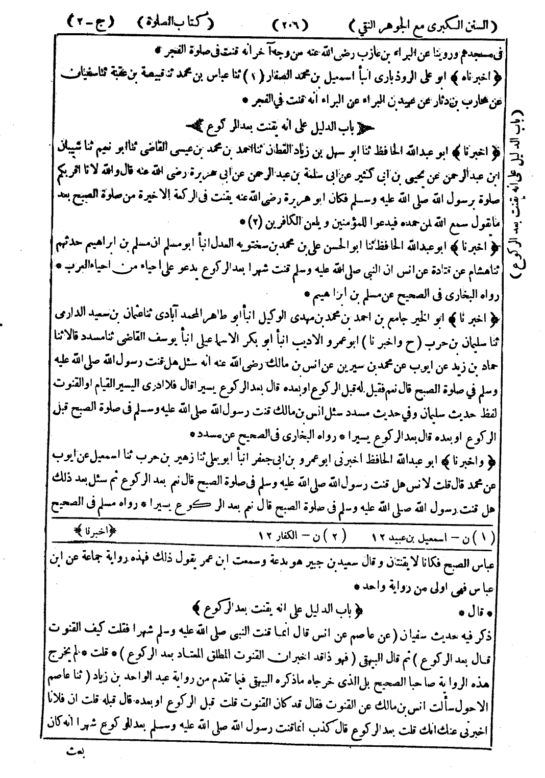 عباس الصبح فكانا لا يقنتان وقال سعيد بن جبير هو بدعة وسمعت ابن عمر يقول ذلك فهذه رواية جماعة عن ابن عباس فهى اولى من رواية واحد * * قال * (باب الدليلى على انه يقنت بعد الركوع) ذكر فيه حديث سفيان (عن عاصم عن انس قال انما قنت النبي صلى الله عليه وسلم شهرا فقلت كيف القنوت قال بعد الركوع) ثم قال البيهقى (فهو ذاقد اخبر ان القنوت المطلق المعتاد بعد الركوع) * قلت * لم يخرج هذه الرواية صاحبا الصحيح بل الذى خرجاه ما ذكره البيهقى فيما تقدم من رواية عبد الواحد بن زياد (ثنا عاصم الاحول سألت انس بن مالك عن القنوت فقال قد كان القنوت قلت قبل الركوع أو بعده قال قبله قلت ان فلانا اخبرني عنك انك قلت بعد الركوع قال كذب انما قنت رسول الله صلى الله عليه وسلم بعد الركوع شهرا انه كان