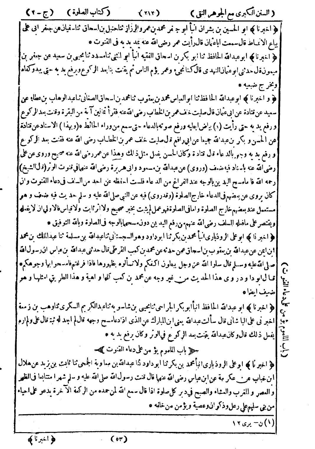 (أخبرنا) أبو الحسين بن بشران انبأ أبو جعفر محمد بن عمرو الرزاز ثنا حنبل بن اسحاق ثنا سفيان عن جعفر ابى على بياع الانماط قال سمعت ابا عثمان قال رأيت عمر رضى الله عنه يمد يديه في القنوت *