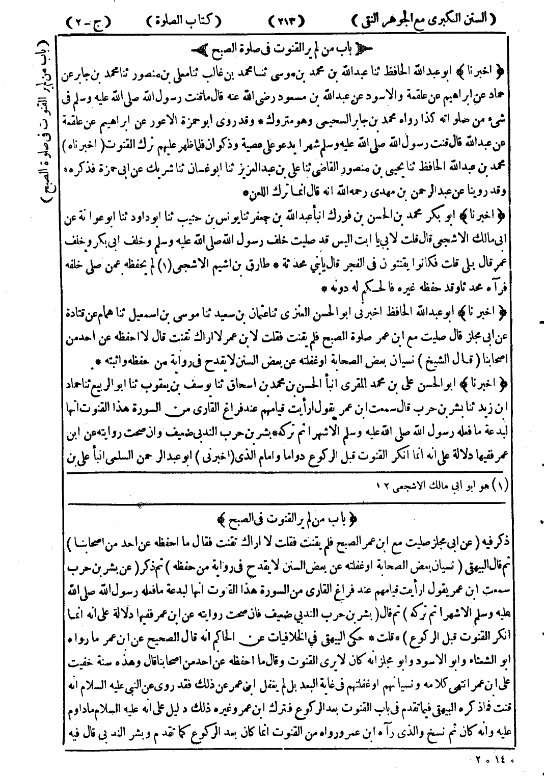 (باب من لم ير القنوت في الصبح) ذكر فيه (عن ابن مجلز صليت مع ابن عمر الصبح فلم يقنت فقلت لا اراك تقنت فقال ما احفظه عن احد من اصحابنا) ثم قال البيهقى (نسيان بعض الصحابة أو غفلته عن بعض السنن لا يقدح في رواية من حفظه) ثم ذكر (عن بشر بن حرب سمعت ابن عمر يقول ارأيت قيامهم عند فراغ القارى من السورة هذا القنوت انها لبدعة ما فعله رسول الله صلى الله عليه وسلم الاشهر اثم تركه) ثم قال (بشر بن حرب الندبي ضعيف فان صحت روايته عن ابن عمر ففيها دلالة على انه انما انكر القنوت قبل الركوع) * قلت * حكى البيهقى في الخلافيات عن الحاكم انه قال الصحيح عن ابن عمر ما رواه أبو الشعثاء وابو الاسود وابو مجلز انه كان لا يرى القنوت وقال ما احفظه عن احد من اصحابنا قال وهذه سنة خفيت على ابن عمر انتهى كلامه ونسيانهم أو غفلتهم في غاية البعد بل لم يغفل ابن عمر عن ذلك فقد روى عن النبي عليه السلام انه قنت فما ذكره البيهقى فيما تقدم في باب القنوت بعد الركوع فترك ابن عمر وغيره ذلك دليل على انه عليه السلام ما داوم عليه وانه كان ثم نسخ والذى رآه ابن عمر ورواه من القنوت انما كان بعد الركوع كما تقدم وبشر الندبى قال فيه