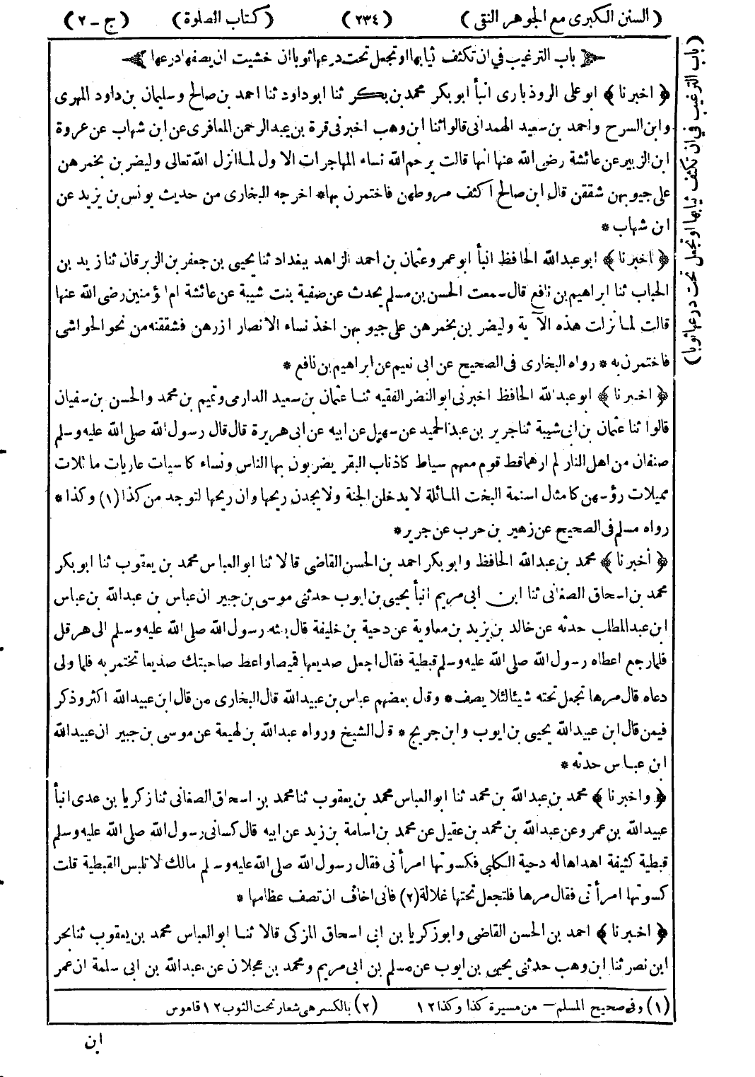 (أخبرنا) أبو عبد الله الحافظ انبأ أبو عمر وعثمان بن احمد الزاهد ببغداد ثنا يحيى بن جعفر بن الزبرقان ثنا زيد بن الحباب ثنا ابراهيم بن نافع قال سمعت الحسن بن مسلم يحدث عن صفية بنت شيبة عن عائشة ام المؤمنين رضى الله عنها قالت لما نزلت هذه الآية وليضربن بخمرهن على جيوبهن اخذ نساء الانصار ازرهن فشققنه من نحو الحواشى فاختمرن به * رواه البخاري في الصحيح عن ابى نعيم عن ابراهيم بن نافع *