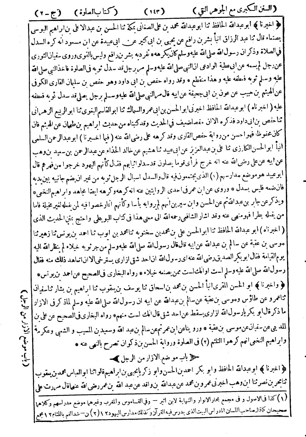 (وأخبرنا) أبو الحسن المقرى انبأ الحسن بن محمد بن اسحاق ثنا يوسف بن يعقوب ثنا ابراهيم بن بشار ثنا سفيان ثنا عمرو عن طاؤس وموسى بن عقبة عن سالم بن عبد الله عن ابيه ان رسول الله صلى الله عليه وسلم لما ذكر في الازار ما ذكر قال أبو بكر يا رسول الله ازارى يسقط عن احد شقى قال انك لست منهم * رواه البخاري في الصحيح عن على بن المدينى عن سفيان عن موسى بن عقبة * وروينا عن ابن عمر ثم عن سالم بن عبد الله وسعيد بن المسيب والشعبى وعكرمة وابراهيم النخعي انهم كرهوا التلثم (2) في الصلوة ورواية الحسن بن ذكوان تصرح بالنهي عنه *