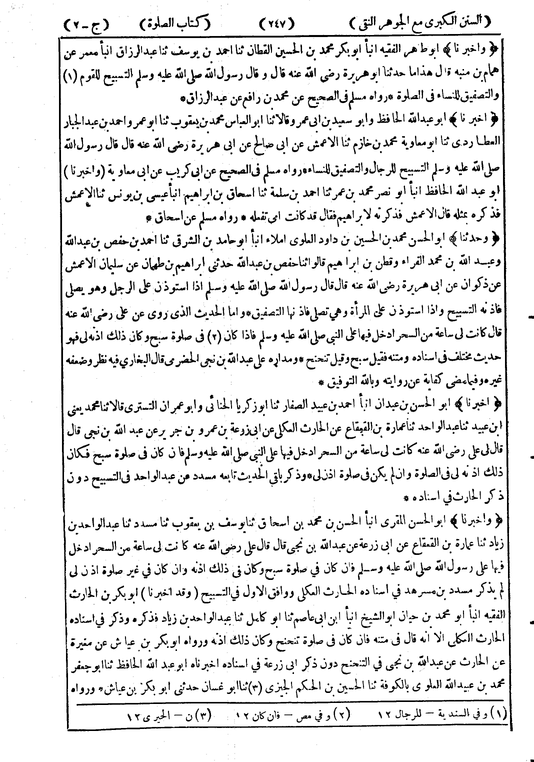 (وأخبرنا) أبو طاهر الفقيه انبأ أبو بكر محمد بن الحسين القطان ثنا احمد بن يوسف ثنا عبد الرزاق انبأ معمر عن همام بن منبه قال هذا ما حدثنا أبو هريرة رضى الله عنه قال وقال رسول الله صلى الله عليه وسلم التسبيح للقوم (1) والتصفيق للنساء في الصلوة * رواه مسلم في الصحيح عن محمد بن رافع عن عبد الرزاق *