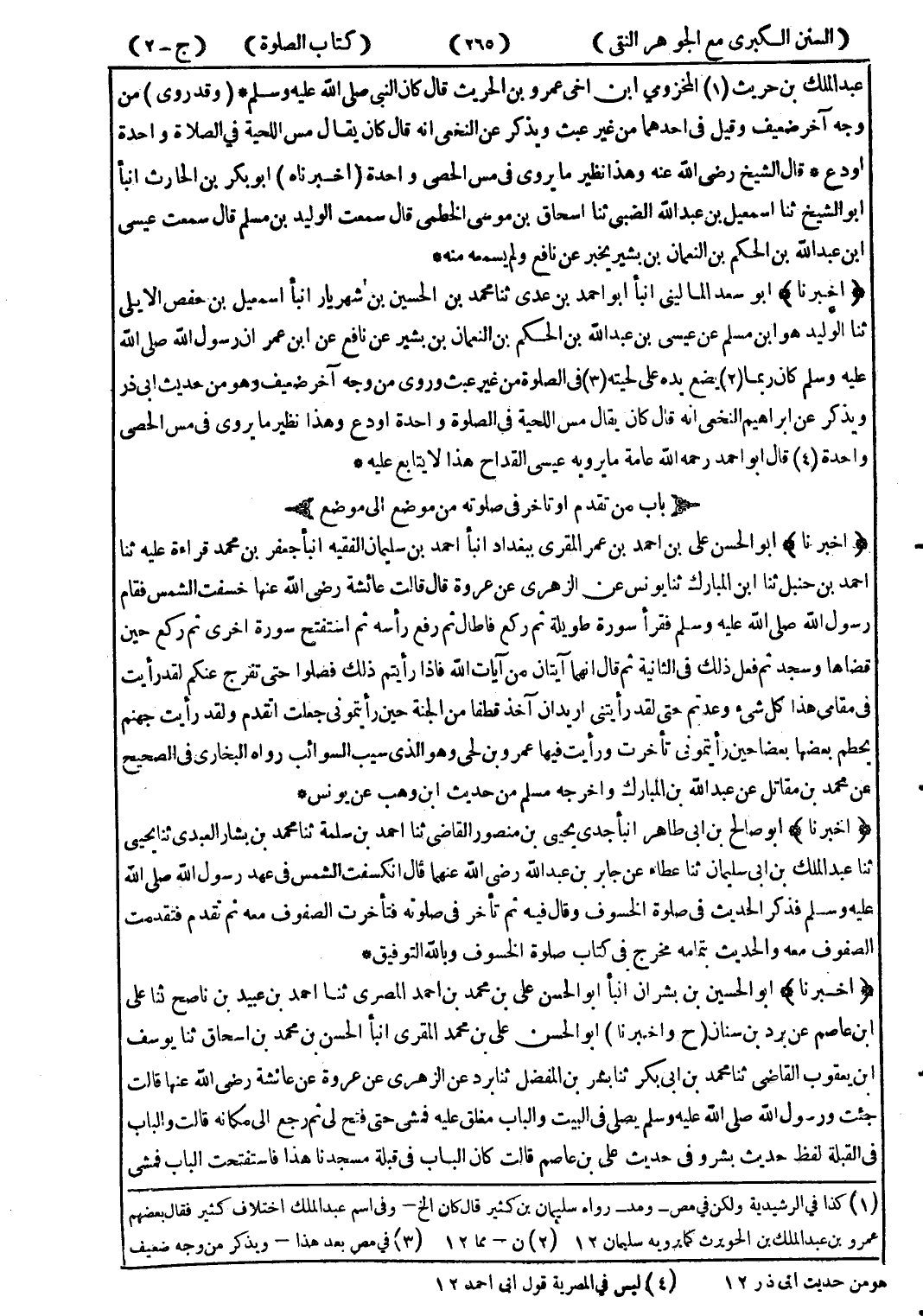 (أخبرنا) أبو الحسن على بن احمد بن عمر المقرى ببغداد انبأ احمد بن سليمان الفقيه انبأ جعفر بن محمد قراءة عليه ثنا احمد بن حنبل ثنا ابن المبارك ثنا يونس عن الزهري عن عروة قال قالت عائشة رضى الله عنها خسفت الشمس فقام رسول الله صلى الله عليه وسلم فقرأ سورة طويلة ثم ركع فاطال ثم رفع رأسه ثم استفتح سورة اخرى ثم ركع حين قضاها وسجد ثم فعل ذلك في الثانية ثم قال انهما آيتان من آيات الله فإذا رأيتم ذلك فصلوا حتى تفرج عنكم لقد رأيت في مقامي هذا كل شئ وعدتم حتى لقد رأيتنى اريد ان آخذ قطفا من الجنة حتى رأيتموني جعلت اتقدم ولقد رأيت جهنم يحطم بعضها بعضا حين رأيتموني تأخرت ورأيت فيها عمرو بن لحى وهو الذى سيب السوائب رواه البخاري في الصحيح عن محمد بن مقاتل عن عبد الله بن المبارك واخرجه مسلم من حديث ابن وهب عن يونس *