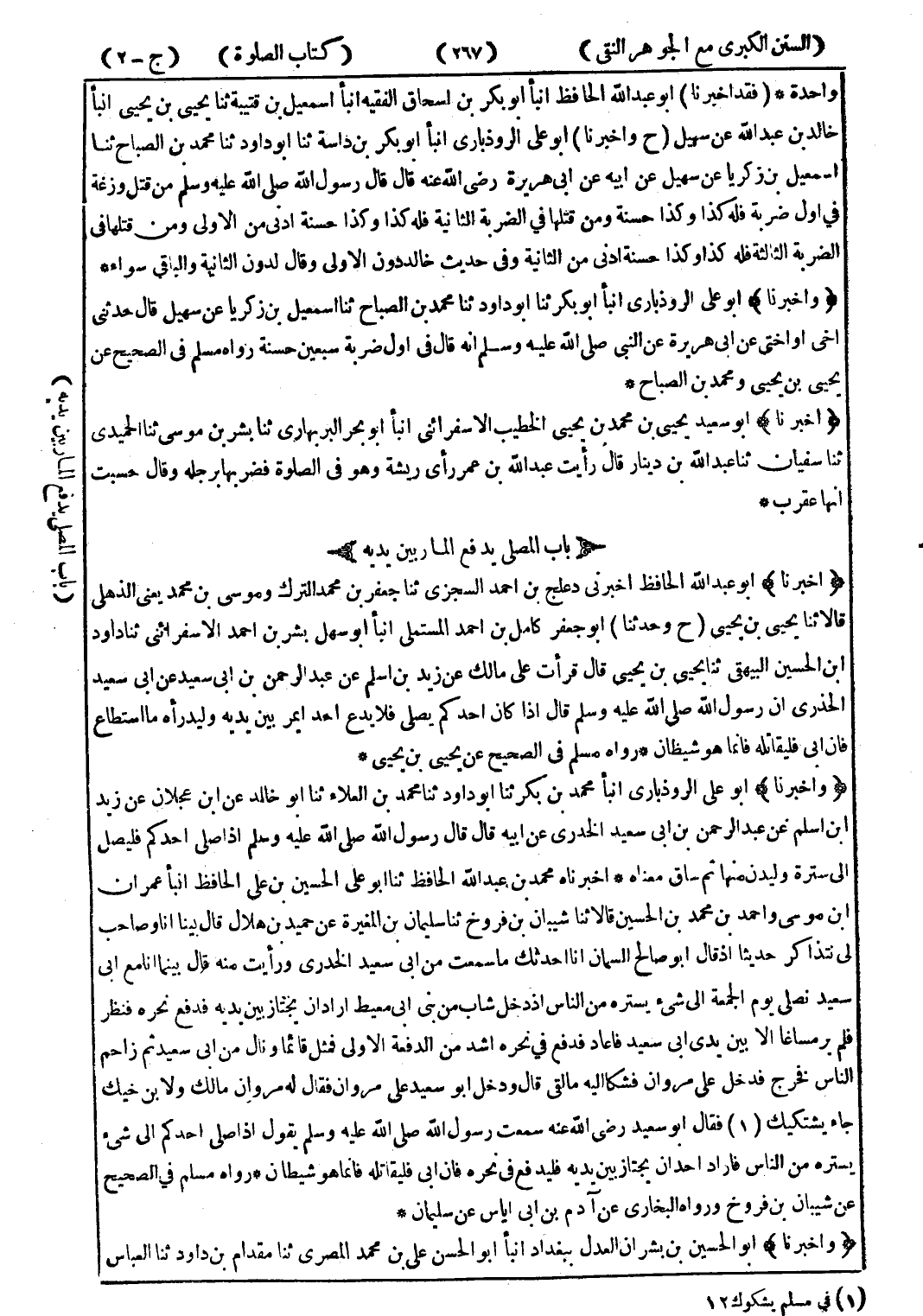 (ح وحدثنا) أبو جعفر كامل بن احمد المستملى انبأ أبو سهل بشر بن احمد الاسفرائنى ثنا داود ابن الحسين البيهقى ثنا يحيى بن يحيى قال قرأت على مالك عن زيد بن اسلم عن عبد الرحمن بن ابى سعيد عن ابى سعيد الخدرى ان رسول الله صلى الله عليه وسلم قال إذا كان احدكم يصلى فلا يدع احدا يمر بين يديه وليدرأه ما استطاع فان ابى فليقاتله فانما هو شيطان * رواه مسلم في الصحيح عن يحيى بن يحيى *