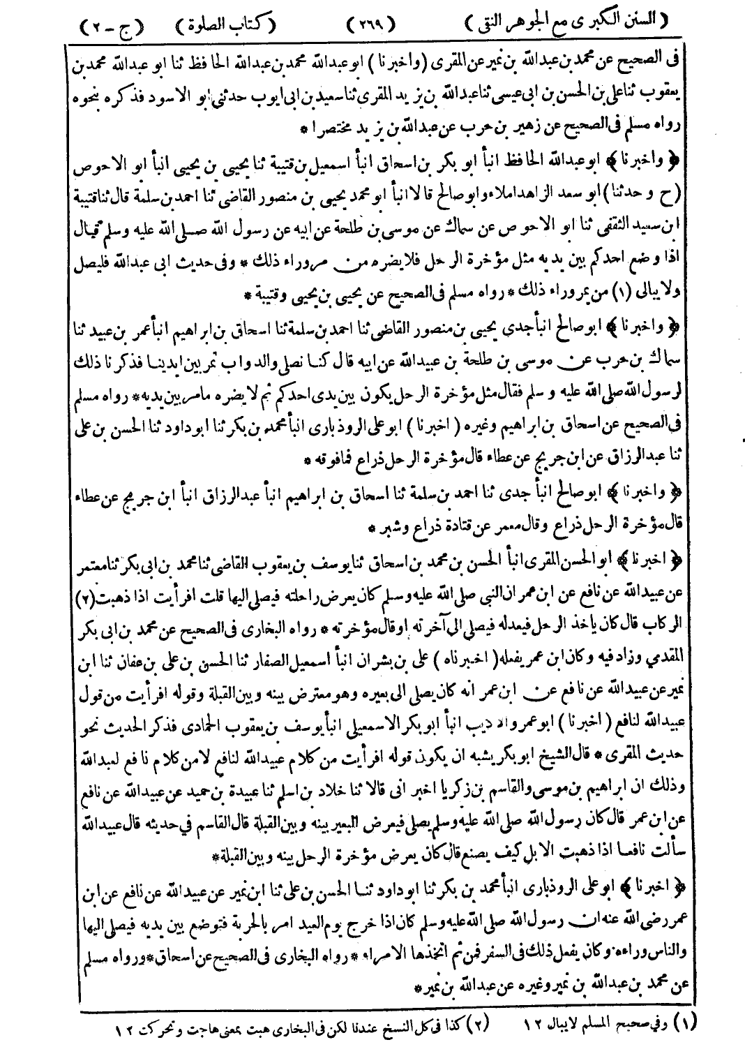 (أخبرنا) أبو عمرو الاديب انبأ أبو بكر الاسمعيلى انبأ يوسف بن يعقوب الحمادي فذكر الحديث نحو حديث المقرى * قال الشيخ أبو بكر يشبه ان يكون قوله افرأيت من كلام عبيد الله لنافع لا من كلام نافع لعبد الله وذلك ان ابراهيم بن موسى والقاسم بن زكريا اخبراني قالا ثنا خلاد بن اسلم ثنا عبيدة بن حميد عن عبيدالله عن نافع عن ابن عمر قال كان رسول الله صلى الله عليه وسلم يصلى فيعرض البعير بينه وبين القبلة قال القاسم في حديثه قال عبيد الله سألت نافعا إذا ذهبت الابل كيف يصنع قال كان يعرض مؤخرة الرحل بينه وبين القبلة *