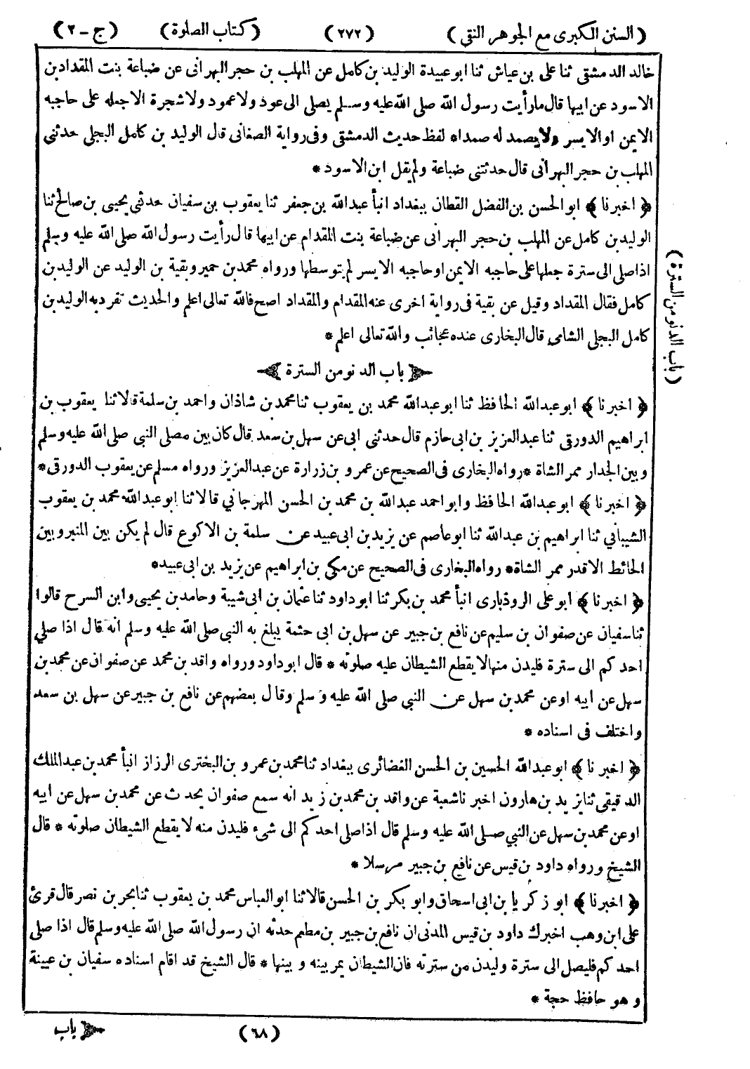(أخبرنا) أبو زكريا بن ابى اسحاق وابو بكر بن الحسن قالا ثنا أبو العباس محمد بن يعقوب ثنا بحربن نصر قال قرئ على ابن وهب اخبرك داود بن قيس المدنى ان نافع بن جبير بن مطعم حدثه ان رسول الله صلى الله عليه وسلم قال إذا صلى احدكم فليصل إلى سترة وليدن من سترته فان الشيطان يمر بينه وبينها * قال الشيخ قد اقام اسناده سفيان بن عيينة وهو حافظ حجة *