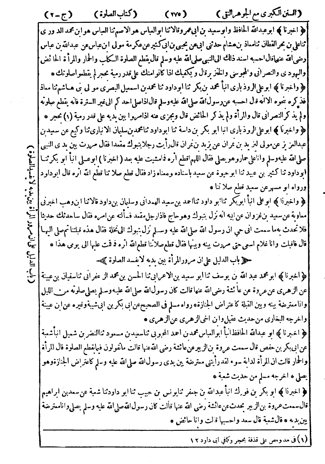(وأخبرنا) أبو على الروذبارى انبأ محمد بن بكر ثنا أبو داود ثنا محمد بن اسمعيل البصري مولى بنى هاشم ثنا معاذ فذكره بنحوه الا انه قال احسبه عن رسول الله صلى الله عليه وسلم قال إذا صلى احدكم إلى غير السترة فانه يقطع صلوته ولم يذكر النصراني قال والمرأة ولم يذكر الحائض قال ويجزى عنه إذا مروا بين يديه على قدر رمية (1) بحرج *