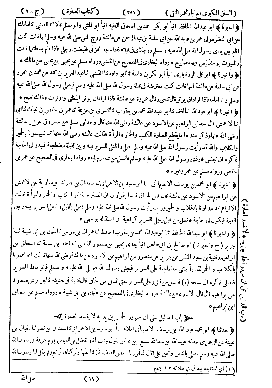 (أخبرنا) أبو محمد بن يوسف الاصبهاني انبا أبو سعيد بن الاعرابي ثنا سعدان بن نصر ثنا أبو معاوية عن الاعمش عن ابراهيم عن الاسود عن عائشة قال قيل لها ان ناسا يقولون ان الصلوة يقطعها الكلب والحمار والمرأة قالت الا اراهم قد عدلونا بالكلاب والحمير وربما رأيت رسول الله صلى الله عليه وسلم يصلى بالليل وانا على السرير بينه وبين