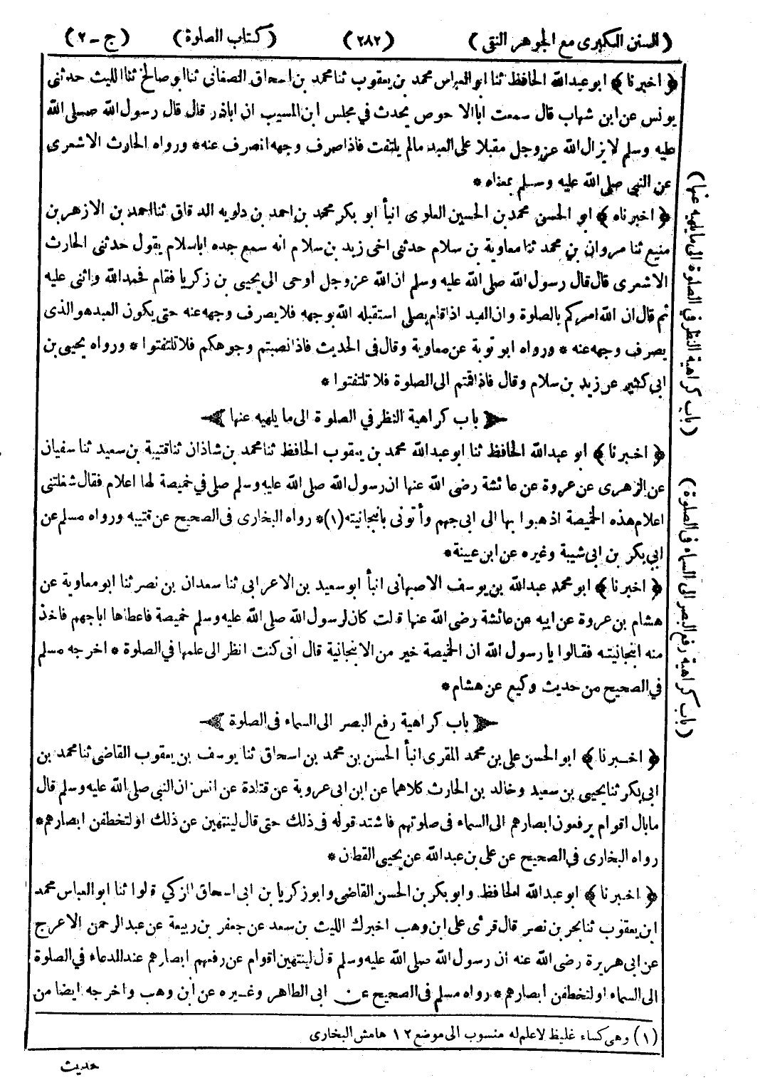 (أخبرنا) أبو الحسن على بن محمد المقرى انبأ الحسن بن محمد بن اسحاق ثنا يوسف بن يعقوب القاضى ثنا محمد بن ابى بكر ثنا يحيى بن سعيد وخالد بن الحارث كلاهما عن ابن ابى عروبة عن قتادة عن انس ان النبي صلى الله عليه وسلم قال ما بال اقوام يرفعون اصارهم إلى السماء في صلوتهم فاشتد قوله في ذلك حتى قال لينتهين عن ذلك أو لتخطفن ابصارهم * رواه البخاري في الصحيح عن على بن عبد الله عن يحيى القطان *
