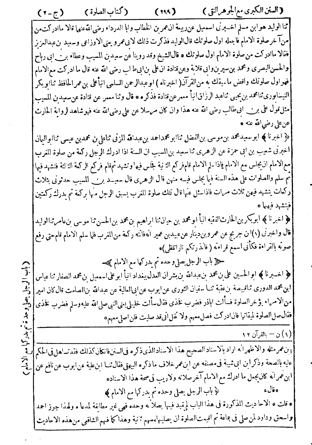 ابن عمر مثله والاظهر انه اراد بالاسناد الصحيح هذا الاسناد الذى ذكره في السنن فان كان كذلك فقد تساهل في الحكم عليه بالصحة وذكر ابن ابى شيبة في مصنفه عن ابن عمر خلاف ما ذكره البيهقى فقال ثنا ابن علية عن ايوب عن نافع عن ابن عمر انه كان يجعل ما ادرك مع الامام آخر صلاته ولا ريب في صحة هذا الاسناد * * قال * (باب الرجل يصلى وحده ثم يدركها مع الامام) * قلت * الاحاديث المذكورة في هذا الباب لم يقيد فيها بصلاته وحده فهى غير مطابقة لمدعاه ولهذا جوز احمد واسحق وداود لمن صلى في جماعة ثم اقيمت الصلوة ان يصليها معهم ثانيه وهذا كما فهم الشافعي من هذه الاحاديث