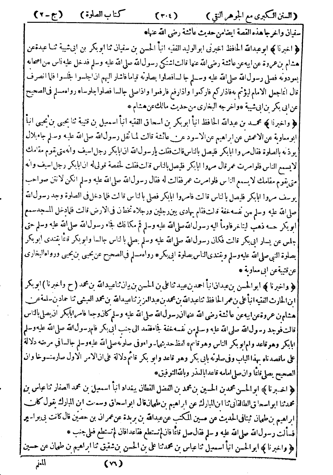(وأخبرنا) محمد بن عبد الله الحافظ انبأ أبو بكر بن اسحاق الفقيه انبأ اسمعيل بن قيتبة ثنا يحيى بن يحيى انبأ أبو معاوية عن الاعمش عن ابراهيم عن الاسود عن عائشة قالت لما ثقل رسول الله صلى الله عليه وسلم جاء بلال يوذنه بالصلوة فقال مروا ابا بكر فليصل بالناس قالت فقلت يا رسول الله ان ابا بكر رجل اسيف وانه متى يقوم مقامك لا يسمع الناس فلوا امرت عمر قال مروا ابا بكر فليصل بالناس قالت فقلت لحفصة قولى له ان ابا بكر رجل اسيف وانه متى يقوم مقامك لا يسمع الناس فلو امرت عمر فقالت له فقال رسول الله صلى الله عليه وسلم انكن لا نتن صواحب