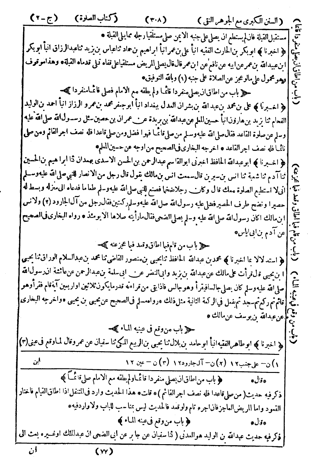 * قال * (باب من اطاق ان يصلى منفردا قائما ولم يطقه مع الامام صلى قائما) ذكر فيه حديث (من صلى قاعدا فله نصف اجر القائم) * قلت * هذا الحديث وارد في المتنفل إذا اطاق القيام فاختار القعود واما المريض العاجز فان اجره تام ولو قعد فالحديث ليس بمناسب للباب ولا وارد فيه * * قال * (باب من وقع في عينه الماء) ذكر فيه حديث عبد الله بن الوليد هو العدنى (ثنا سفيان عن جابر عن ابى الضحى ان عبد الملك أو غيره بعث إلى