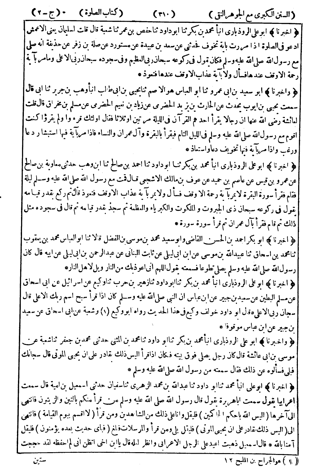 (أخبرنا) أبو على الروذبارى انبأ محمد بن بكر ثنا أبو داود ثنا احمد بن صالح ثنا ابن وهب حدثنى معاوية بن صالح عن عمرو بن قيس عن عاصم بن حميد عن عوف بن مالك الاشجعى قال قمت مع رسول الله صلى الله عليه وسلم ليلة فقام فقرأ سورة البقرة لا يمر بآية رحمة الا وقف فسأل ولا يمر بآية عذاب الا وقف فتعوذ قال ثم ركع بقدر قيامه يقول في ركوعه سبحان ذى الجبروت والملكوت والكبرياء والعظمة سجد بقدر قيامه ثم قال في سجوده مثل ذلك ثم قام فقرأ بآل عمران ثم قرأ سورة سورة *