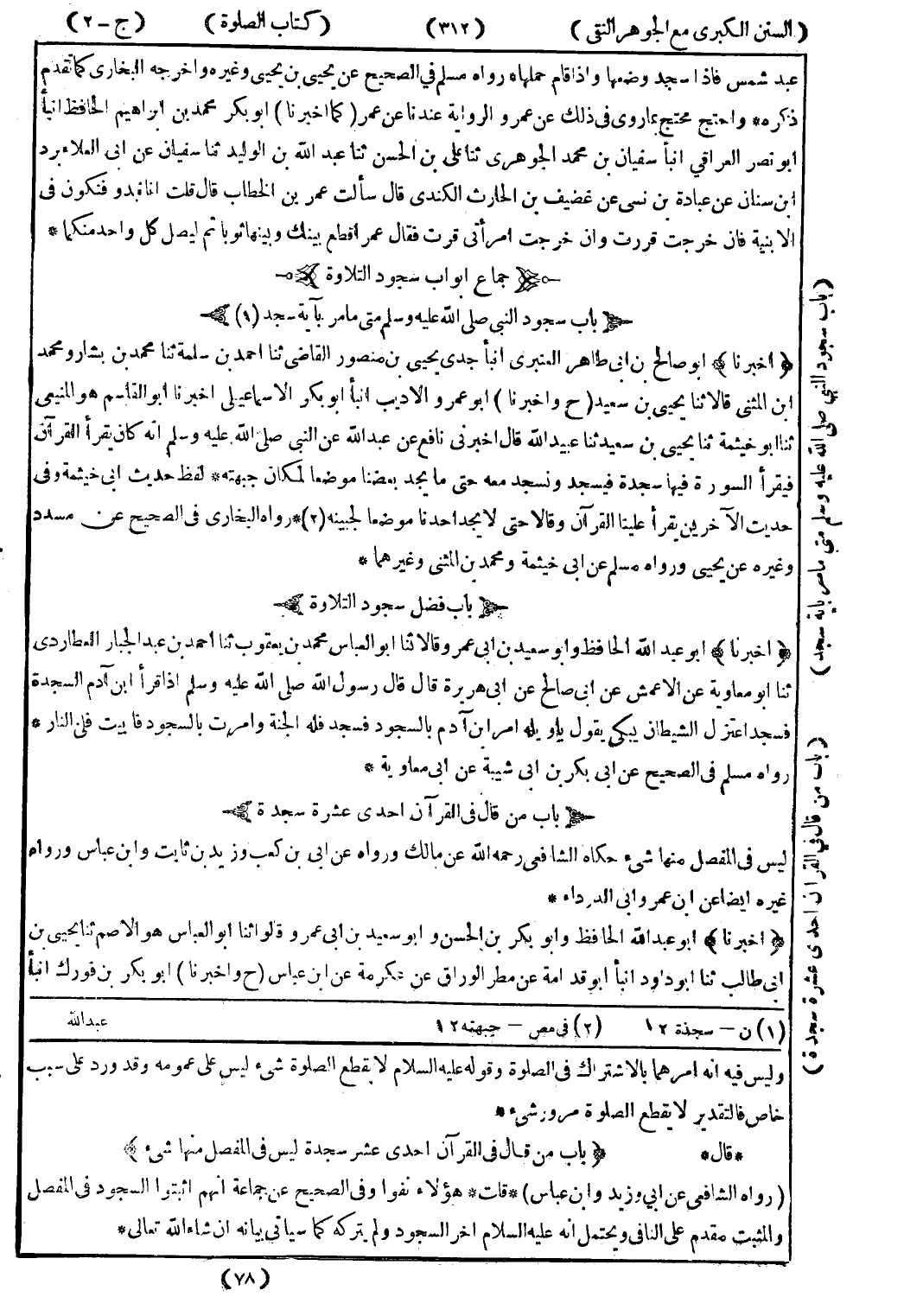 وليس فيه انه امرهما بالاشتراك في الصلوة وقوله عليه السلام لا يقطع الصلوة شئ ليس على عمومه وقد ورد على سبب خاص فالتقدير لا يقطع الصلوة مرور شئ * * قال * (باب من قال في القرآن احدى عشر سجدة ليس في المفصل منها شئ) (رواه الشافعي عن ابي وزيد وابن عباس) * قلت * هؤلاء نفوا وفي الصحيح عن جماعة انهم اثبتوا السجود في المفصل والمثبت مقدم على النافي ويحتمل انه عليه السلام اخر السجود ولم يتركه كما سيأتي بيانه ان شاء الله تعالى *