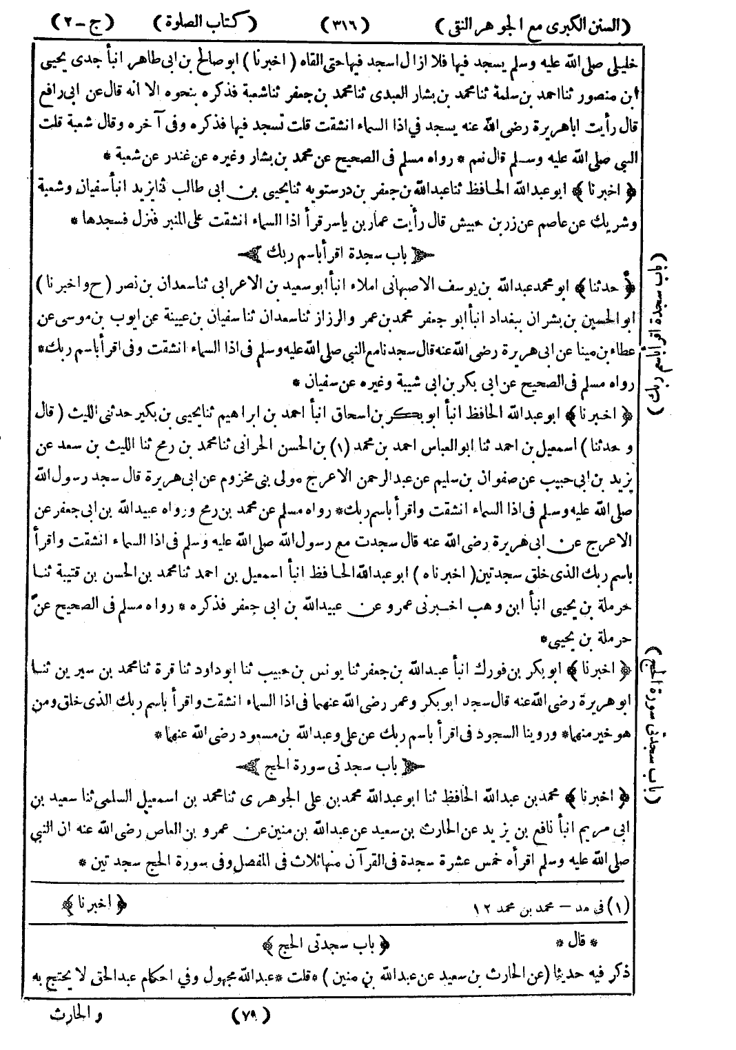 * قال * (باب سجدتي الحج) ذكر فيه حديثا (عن الحارث بن سعيد عن عبد الله بن منين) * قلت * عبد الله مجهول وفي احكام عبد الحق لا يحتج به