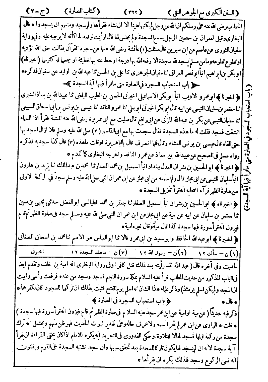 لحديث وفي آخره قال (عبد الله لقد رأيته بعد ذلك قتل كافرا وفي رواية البخاري انه امية بن خلف وتقدم ايضا في الباب المذكور من حديث المطلب قرأ عليه السلام بمكة سوره النجم فسجد وسجد من عنده فرفعت رأسي وابيت ان اسجد ولم يكن اسلم يومئذ) وذكر علماء هذا الشان انه اسلم يوم الفتح فثبت بذلك ان تركهما للسجود كان لكفرهما * * قال * (باب استحباب السجود في الصلوة) ذكر فيه حديثا (عن مية أو امية عن ابن عمر سجد عليه السلام في صلوة الظهر ثم قام فيرون؟؟ انه قرأ سورة فيها سجدة) * قلت * الراوى عن ابن عمر لم يتحر اسمه ولا عرف حاله وعلى تقدير ثبوت الحديث فهو ظن منهم ويحتمل انه ترك سجدة من ركعة قبلها فجسد لها لا للتلاوة وحكى القدورى في التجريد انه يكره للامام إذا كان يخفى القراءة ان يقرأ آية سجدة لانه ان لم يسجد لها يكون تاركا للسجدة بعد تحقق سببها وان سجد تشتبه السجدة على القوم ويظنون انه نسى الركوع وسجد فلذلك يكره ان يقرأها *