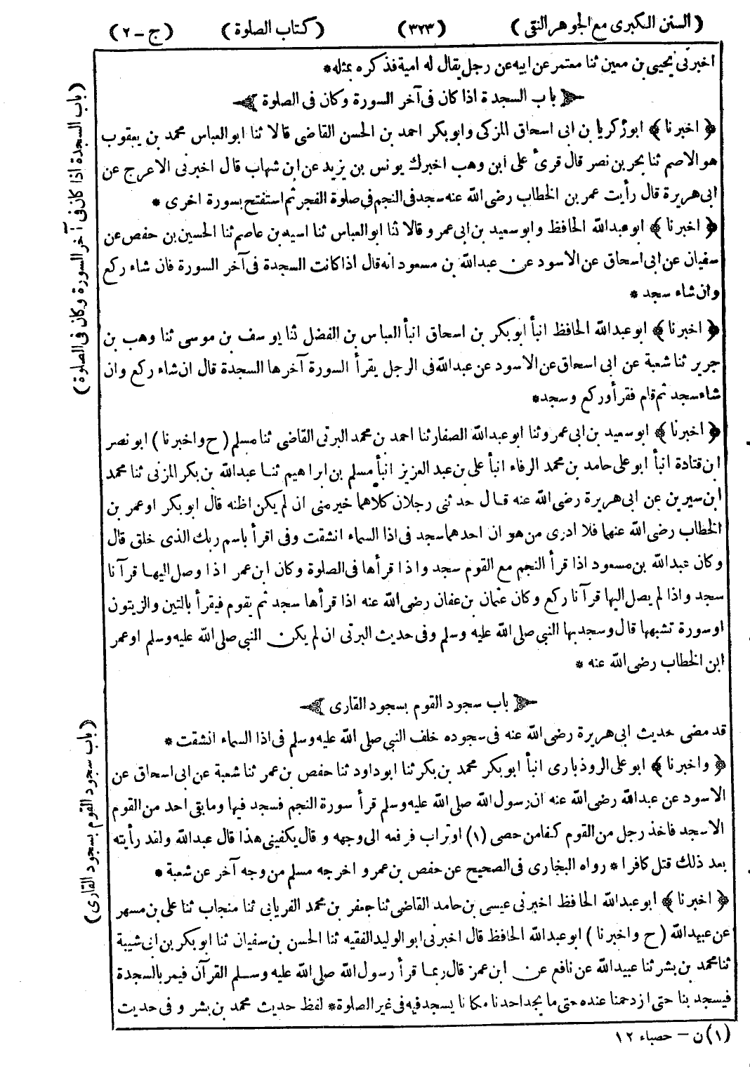 (أخبرنا) أبو زكريا بن ابى اسحاق المزكى وابو بكر احمد بن الحسن القاضى قالا ثنا أبو العباس محمد بن يعقوب هو الاصم ثنا بحر بن نصر قال قرئ على ابن وهب اخبرك يونس بن يزيد عن ابن شهاب قال اخبرني الاعرج عن ابى هريرة قال رأيت عمر بن الخطاب رضى الله عنه سجد في النجم في صلوة الفجر ثم استفتح بسورة اخرى *