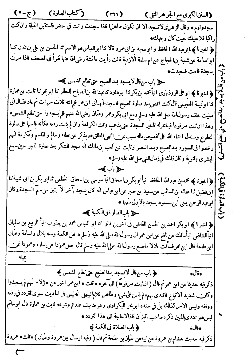* قال * (باب من قال لا يسجد بعد الصبح حتى تطلع الشمس) ذكر فيه حديثا عن ابن عمر ثم قال (ان ثبت مرفوعا) إلى آخره * قلت * ابن عمر اخبر عن هؤلاء انهم لم يسجدوا وكان شديد الاتباع فاقتدى بهم ولم يقس على شئ وظاهر كلام البيهقى انه ليس في الحديث سوى التردد في رفعه ووقفه وليس الامر كذلك بل في سنده أبو بحر البكراوى وهو ضعيف عندهم وشيخه ثابت بن عمارة قال أبو حاتم ليس هو عندي بالمتين ذكره صاحب الميزان فإذا لا حاجة إلى هذا التردد * * قال * (باب الصلاة في الكعبة) ذكر فيه حديث هشام بن عروة عن ابيه عن عثمان بن طلحة ثم قال (وفيه ارسال بين عروة وعثمان) * قلت * عروة