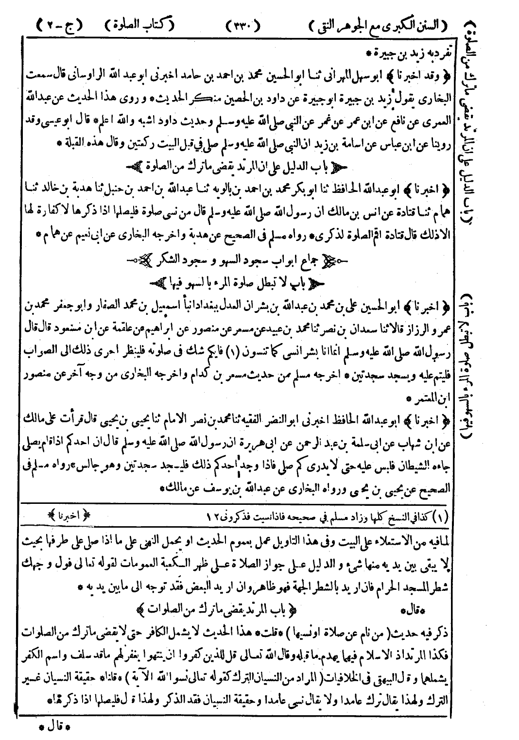 لما فيه من الاستعلاء على البيت وفي هذا التأويل عمل بعموم الحديث أو يحمل النهى على ما إذا صلى على طرفها بحيث لا يبقى بين يديه منها شئ والدليل على جواز الصلاة على ظهر الكعبة العمومات لقوله تعالى فول وجهك شطر المسجد الحرام فان اريد بالشطر الجهة فهو ظاهر وان اريد البعض فقد توجه إلى ما بين يديه * * قال * (باب المرتد يقضى ما ترك من الصلوات) ذكر فيه حديث (من نام عن صلاة أو نسيها) * قلت * هذا الحديث لا يشمل الكافر حتى لا يقضى ما ترك من الصلوات فكذا المرتد إذ الاسلام فيهما يهدم ما قبله وقال الله تعالى قل للذين كفروا ان ينتهوا يغفر لهم ما قد سلف واسم الكفر يشملهما وقال البيهقى في الخلافيات (المراد من النسيان الترك كقوله تعالى نسوا الله الآية) * قلنا * حقيقة النسيان غير الترك ولهذا يقال ترك عامدا ولا يقال نسى عامدا وحقيقة النسيان فقد الذكر ولهذا قال فليصلها إذا ذكرها *