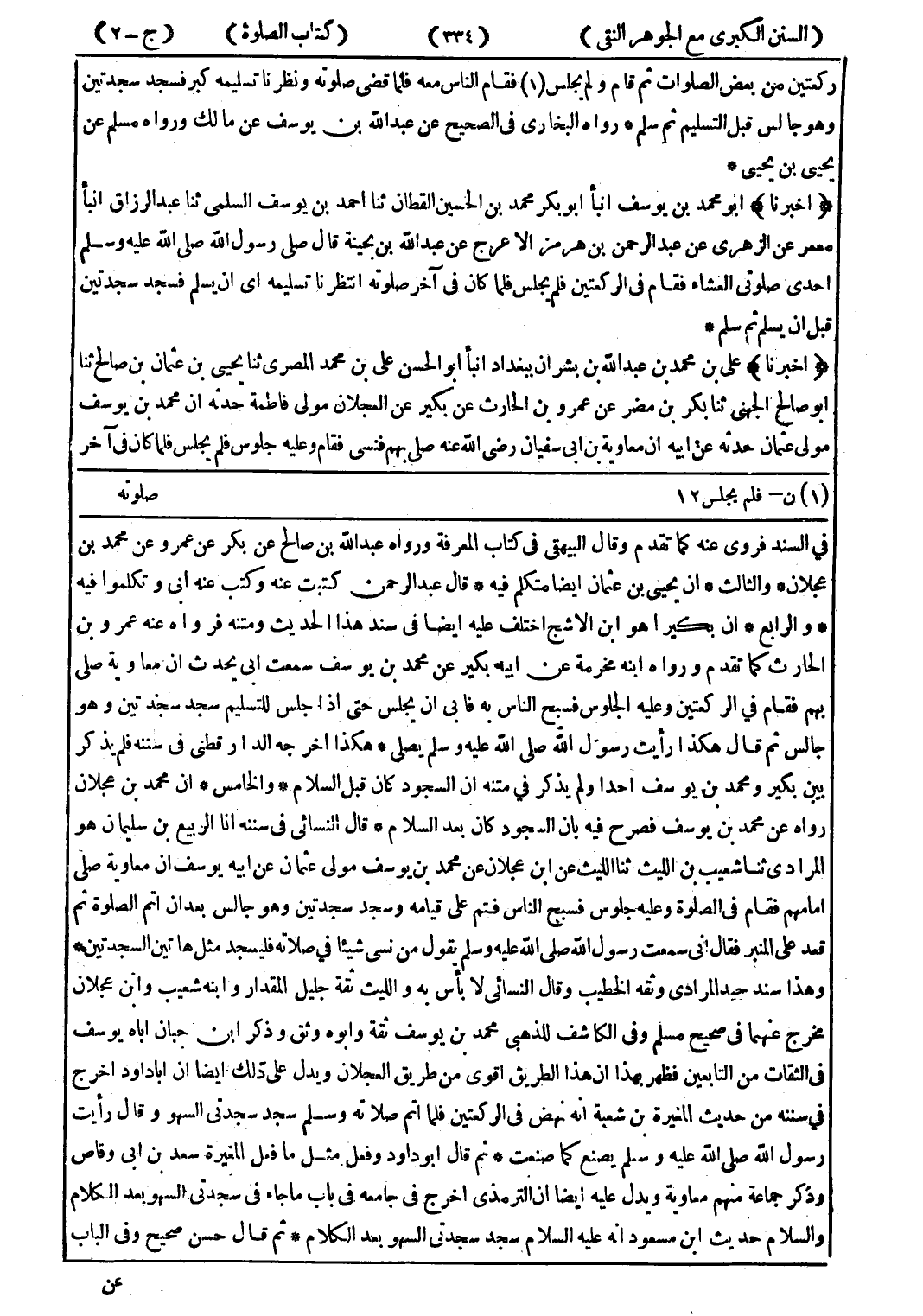 في السند فروى عنه كما تقدم وقال البيهقى في كتاب المعرفة ورواه عبد الله بن صالح عن بكر عن عمرو عن محمد بن عجلان * والثالث * ان يحيى بن عثمان ايضا متكلم فيه * قال عبد الرحمن كتبت عنه وكتب عنه ابى وتكلموا فيه * والرابع * ان بكيرا هو ابن الاشج اختلف عليه ايضا في سند هذا الحديث ومتنه فرواه عنه عمرو بن الحارث كما تقدم ورواه ابنه مخرمة عن ابيه بكير عن محمد بن يوسف سمعت ابى يحدث ان معاوية صلى بهم فقام في الركعتين وعليه الجلوس فسبح الناس به فابى ان يجلس حتى إذا جلس للتسليم سجد سجدتين وهو جالس ثم قال هكذا رأيت رسول الله صلى الله عليه وسلم يصلى * هكذا اخرجه الدارقطني في سننه فلم يذكر بين بكير ومحمد بن يوسف احدا ولم يذكر في متنه ان السجود كان قبل السلام * والخامس * ان محمد بن عجلان رواه عن محمد بن يوسف فصرح فيه بان السجود كان بعد السلام * قال النسائي في سننه انا الربيع بن سليمان هو المرادى ثنا شعيب بن الليث ثنا الليث عن ابن عجلان عن محمد بن يوسف مولى عثمان عن ابيه يوسف ان معاوية صلى امامهم فقام في الصلوة وعليه جلوس فسبح الناس فتم على قيامه وسجد سجدتين وهو جالس بعد ان اتم الصلوة ثم قعد على المنبر فقال انى سمعت رسول الله صلى الله عليه وسلم يقول من نسى شيئا في صلاته فليسجد مثل هاتين السجدتين * وهذا سند جيد المرادى وثقه الخطيب وقال النسائي لا بأس به والليث ثقة جليل المقدار وابنه شعيب وابن عجلان مخرج عنهما في صحيح مسلم وفى الكاشف للذهبي محمد بن يوسف ثقة وابوه وثق وذكر ابن حبان اباه يوسف في الثقات من التابعين فظهر بهذا ان هذا الطريق اقوى من طريق العجلان ويدل على ذلك ايضا ان ابا داود اخرج في سننه من حديث المغيرة بن شعبة انه نهض في الركعتين فلما اتم صلاته وسلم سجد سجدتي السهو وقال رأيت رسول الله صلى الله عليه وسلم يصنع كما صنعت * ثم قال أبو داود وفعل مثل ما فعل المغيرة سعد بن ابى وقاص وذكر جماعة منهم معاوية ويدل عليه ايضا ان الترمذي اخرج في جامعه في باب ما جاء في سجدتي السهو بعد الكلام