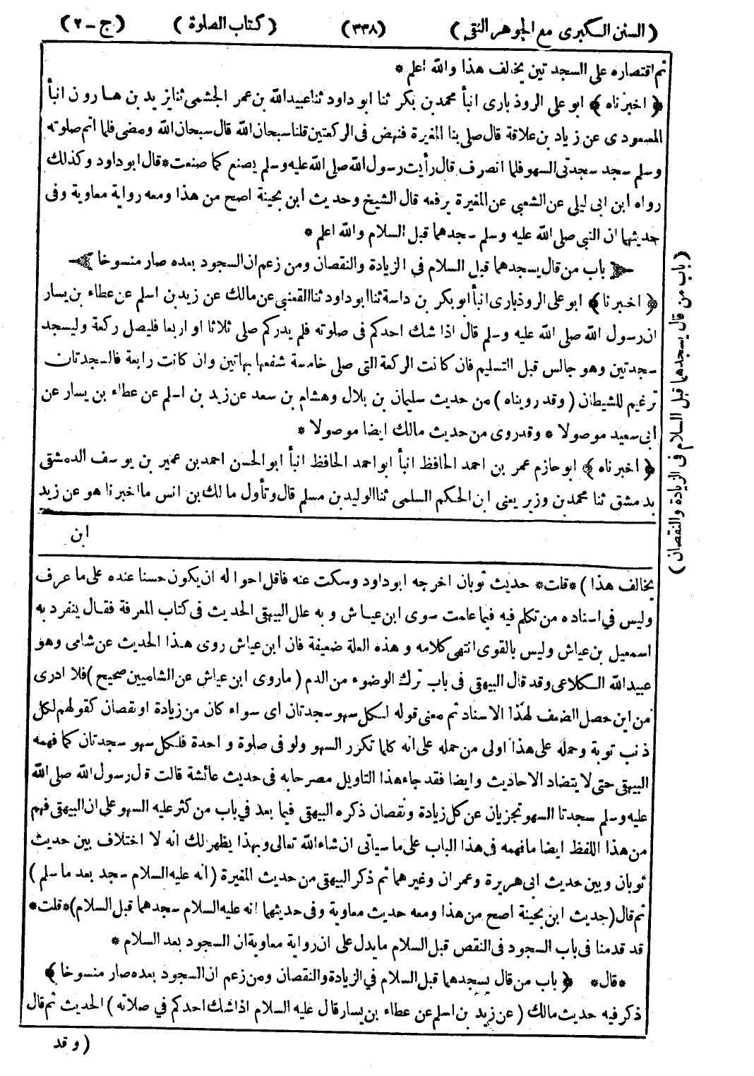 عليه وسلم سجدتا السهو تجزيان عن كل زيادة ونقصان ذكره البيهقى فيما بعد في باب من كثر عليه السهو على ان البيهقى فهم من هذا اللفظ ايضا ما فهمه في هذا الباب على ما سيأتي ان شاء الله تعالى وبهذا يظهر لك انه لا اختلاف بين حديث ثوبان وبين حديث ابى هريرة وعمران وغيرهما ثم ذكر البيهقى من حديث المغيرة (انه عليه السلام سجد بعد ما سلم) ثم قال (حديث ابن بحينة اصح من هذا ومعه حديث معاوية وفي حديثهما انه عليه السلام سجدهما قبل السلام) * قلت * قد قدمنا في باب السجود في النقص قبل السلام ما يدل على ان رواية معاوية ان السجود بعد السلام * * قال * (باب من قال يسجدهما قبل السلام في الزيادة والنقصان ومن زعم ان السجود بعده صار منسوخا) ذكر فيه حديث مالك (عن زيد بن اسلم عن عطاء بن يسار قال عليه السلام إذا شك احدكم في صلاته) الحديث ثم قال