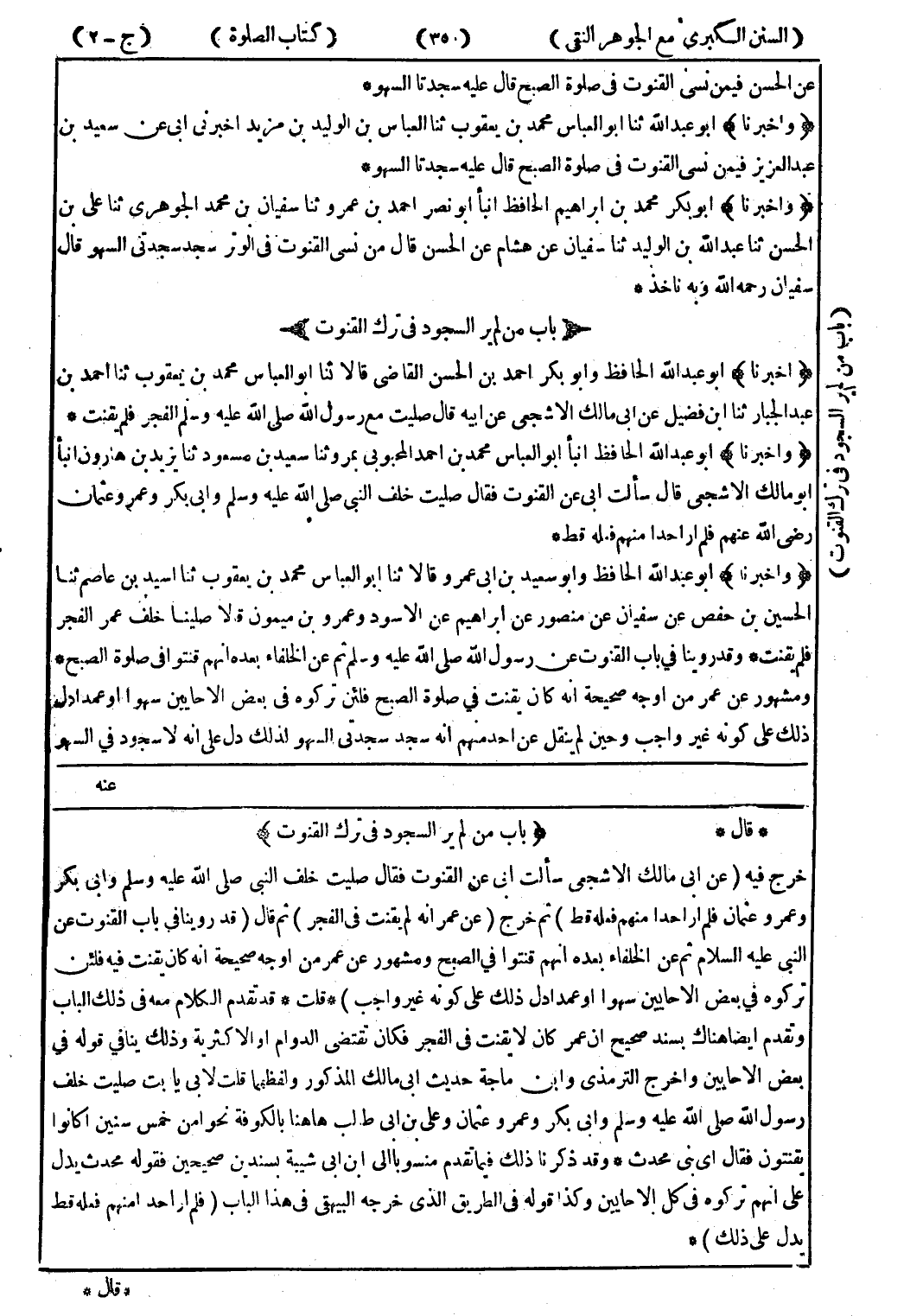 * قال * (باب من لم ير السجود في ترك القنوت) خرج فيه (عن ابى مالك الاشجعى سألت ابى عن القنوت فقال صليت خلف النبي صلى الله عليه وسلم وابى بكر وعمرو عثمان فلم اراحدا منهم فعله قط) ثم خرج (عن عمرانه لم يقنت في الفجر) ثم قال (قد روينا في باب القنوت عن النبي عليه السلام ثم عن الخلفاء بعده انهم قنتوا في الصبح ومشهور عن عمر من اوجه صحيحة انه كان يقنت فيه فلئن تركوه في بعض الاحايين سهوا أو عمدا دل ذلك على كونه غير واجب) * قلت قد تقدم الكلام معه في ذلك الباب وتقدم ايضا هناك بسند صحيح ان عمر كان لا يقنت في الفجر فكان تقتضي الدوام أو الاكثرية وذلك ينافي قوله في بعض الاحايين واخرج الترمذي وابن ماجة حديث ابى مالك المذكور ولفظهما قلت لابي يابت صليت خلف رسول الله صلى الله عليه وسلم وابى بكر وعمرو عثمان وعلى بن ابى طالب ها هنا بالكوفة نحوا من خمس سنين اكانوا يقنتون فقال أي بنى محدث * وقد ذكرنا ذلك فيما تقدم منسوبا إلى ابن ابى شيبة بسندين صحيحين فقوله محدث يدل على انهم تركوه في كل الاحايين وكذا قوله في الطريق الذى خرجه البيهقى في هذا الباب (فلم ار احدا منهم فعله قط يدل على ذلك) *