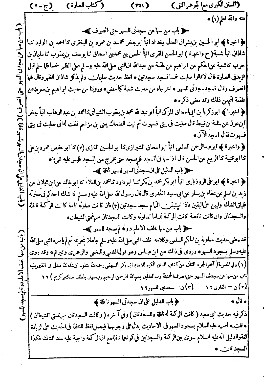 ذكر فيه حديث ابى سعيد (كانت الركعة له نافلة والسجدتان) وفي آخره (وكانت السجدتان مرغمتي الشيطان) * قلت * امره عليه السلام بسجود السهو في الاحاديث يدل على وجوبهما فيحمل لفظ النافلة في الحديث على الزيادة لغة والدليل انه عليه السلام سوى بين الركعة والسجدتين في كونهما نافلة مع ان الركعة واجبة عليه عند الشك فكذا السجدتان *