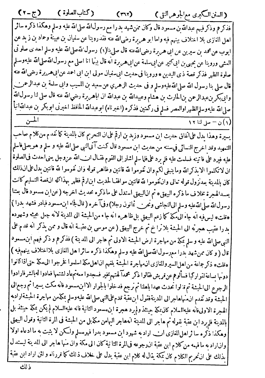 يسيرة وهذا يدل على اتفاق حديث ابن مسعود وزيد بن ارقم على ان التحريم كان بالمدينة كما تقدم من كلام صاحب التمهيد وقد اخرج النسائي في سننه من حديث ابن مسعود قال كنت آتى النبي صلى الله عليه وسلم وهو يصلى فاسلم عليه فيرد على فاتيته فسلمت عليه فلم يرد على فلما سلم اشار إلى القوم فقال ان الله عزوجل يعنى احدث في الصلوة ان لا تكلموا الا بذكر الله وما ينبغى لكم وان تقوموا لله قانتين وظاهر قوله وان تقوموا لله قانتين يدل على ان ذلك كان بالمدينة بعد نزول قوله تعالى وان تقوموا لله قانتين موافقا لحديث ابن ارقم فظهر بهذا كله ان قصة التسليم كانت بعد الهجرة بخلاف ما ذكره البيهقى * ثم ان البيهقى استدل على ما ذكره بحديث اخرجه (عن ابن مسعود قال بعثنا رسول الله صلى الله عليه وسلم إلى النجاشي ونحن ثمانون رجلا) وفي آخره (قال فجاء ابن مسعود فبادر فشهد بدرا) * قلت * ليس فيه انه جاء إلى مكة كما زعم البيهقي بل ظاهره انه جاء من الحبشة إلى المدينة لانه جعل مجيئه وشهوده