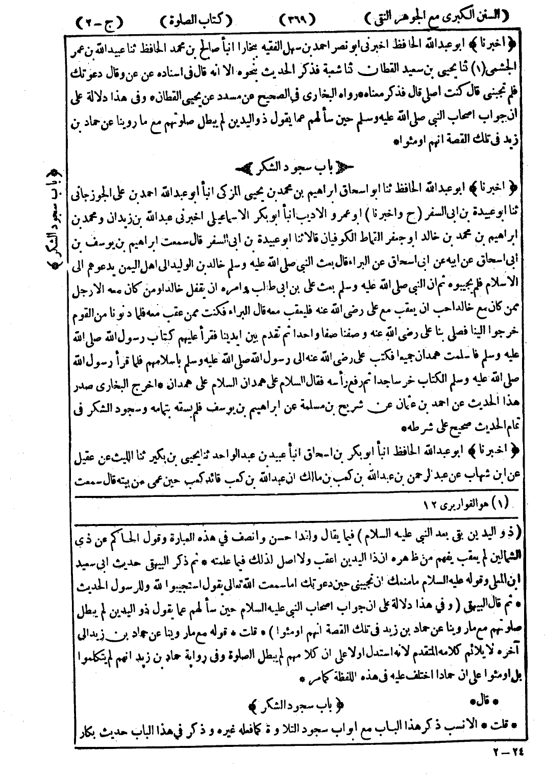 ابن المعلى وقوله عليه السلام ما منعك ان تجيبني حين دعوتك اما سمعت الله تعالى يقول استجيبوا لله وللرسول الحديث * ثم قال البيهقى (وفي هذا دلالة على ان جواب اصحاب النبي عليه السلام حين سألهم عما يقول ذو اليدين لم يبطل صلوتهم مع ما روينا عن حماد بن زيد في تلك القصة انهم اومئوا) * قلت * قوله مع ما روينا عن حماد بن زيد إلى آخره لا يلائم كلامه المتقدم لانه استدل أو لاعلى ان كلامهم لم يبطل الصلوة وفي رواية حماد بن زيد انهم لم يتكلموا بل اومئوا على ان حماد اختلف عليه في هذه اللفظة كما مر * * قال * (باب سجود الشكر) * قلت * الانسب ذكر هذا الباب مع ابواب سجود التلاوة كما فعله غيره وذكر في هذا الباب حديث بكار