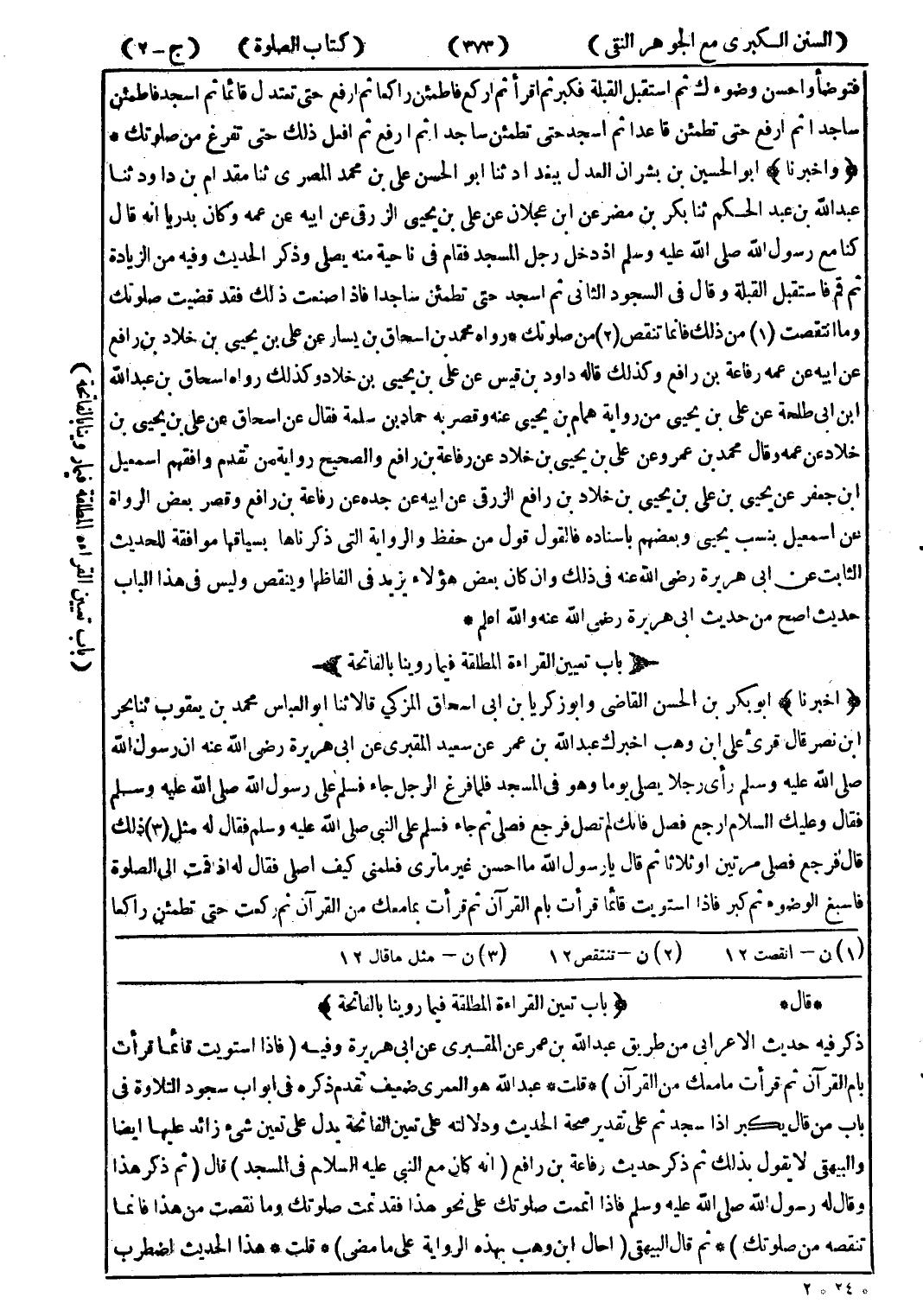 * قال * (باب تعين القراءة المطلقة فيما روينا بالفاتحة) ذكر فيه حديث الاعرابي من طريق عبد الله بن عمر عن المقبرى عن ابى هريرة وفيه (فإذا استويت قائما قرأت بام القرآن ثم قرأت ما معك من القرآن) * قلت * عبد الله هو العمرى ضعيف تقدم ذكره في ابواب سجود التلاوة في باب من قال يكبر إذا سجد ثم على تقدير صحة الحديث ودلالته على تعيين الفاتحة يدل على تعيين شئ زائد عليها ايضا والبيهقي لا يقول بذلك ثم ذكر حديث رفاعة بن رافع (انه كان مع النبي عليه السلام في المسجد) قال (ثم ذكر هذا