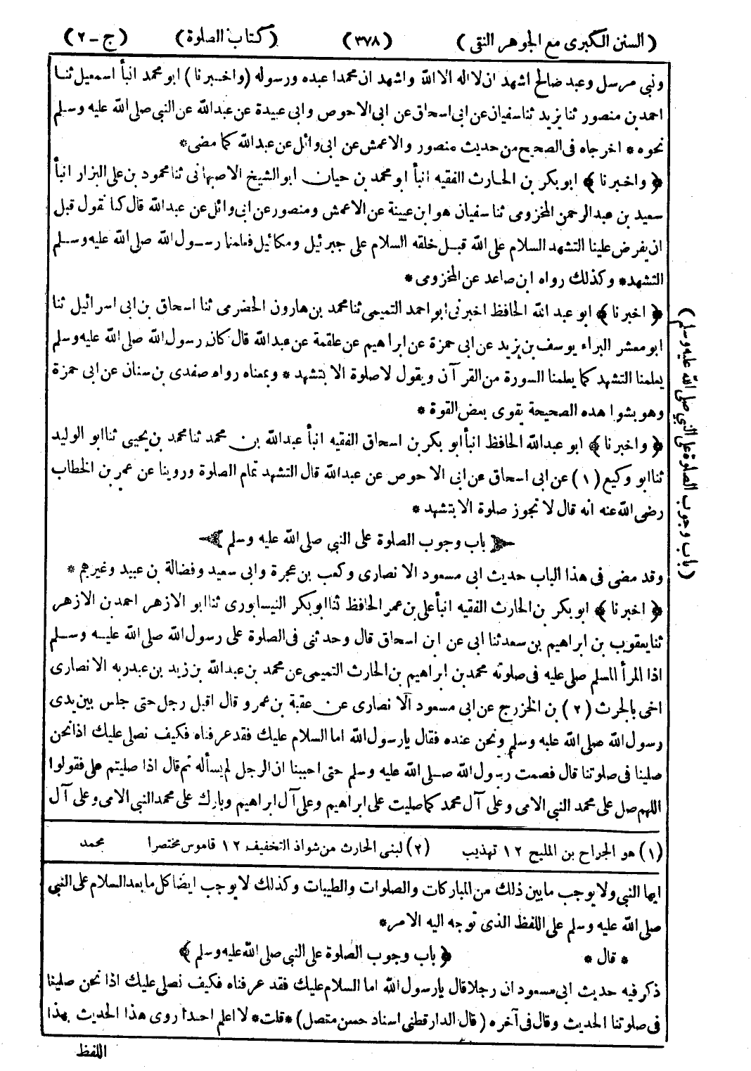 ايها النبي ولا يوجب ما بين ذلك من المباركات والصلوات والطيبات وكذلك لا يوجب ايضا كل ما بعد السلام على النبي صلى الله عليه وسلم على اللفظ الذى توجه إليه الامر * * قال * (باب وجوب الصلوة على النبي صلى الله عليه وسلم) ذكر فيه حديث ابى مسعود ان رجلا قال يا رسول الله اما السلام عليك فقد عرفناه فكيف نصلى عليك إذا نحن صلينا في صلوتنا الحديث وقال في آخره (قال الدارقطني اسناد حسن متصل) * قلت * لا اعلم احدا روى هذا الحديث بهذا