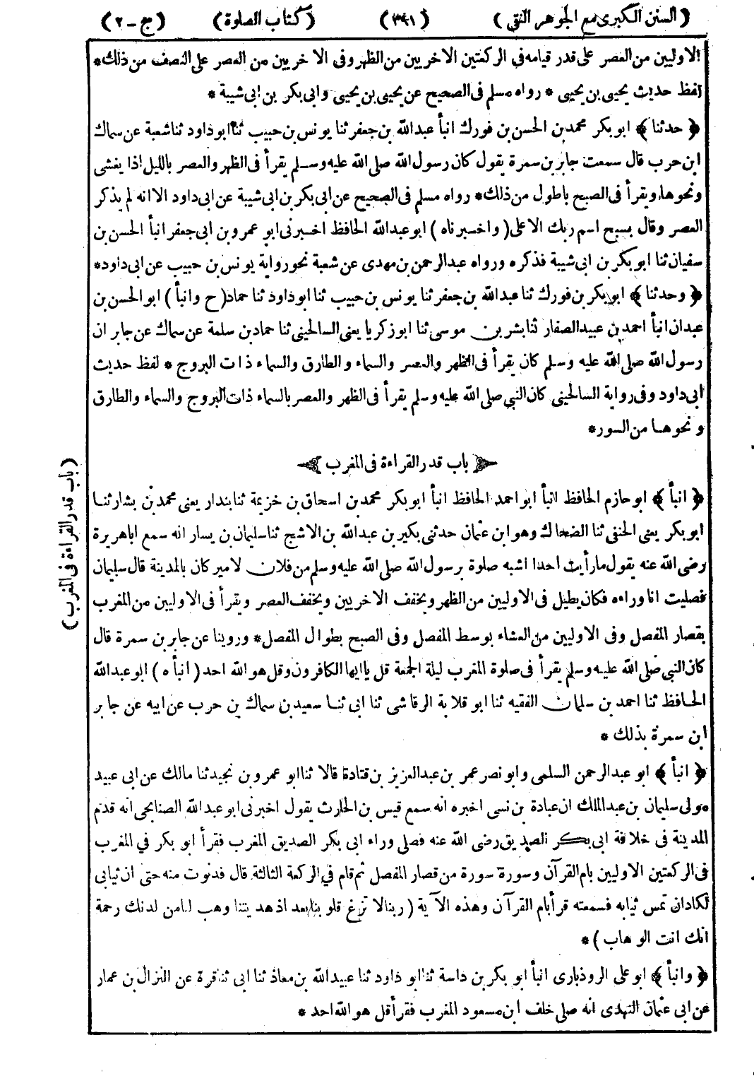 (أنبأ) أبو عبد الرحمن السلمى وابو نصر عمر بن عبد العزيز بن قتادة قالا ثنا أبو عمرو بن نجيد ثنا مالك عن ابى عبيد مولى سليمان بن عبد الملك ان عبادة بن نسى اخبره انه سمع قيس بن الحارث يقول اخبرني أبو عبد الله الصنابحى انه قدم المدينة في خلافة ابى بكر الصديق رضى الله عنه فصلى وراء ابى بكر الصديق المغرب فقرأ أبو بكر في المغرب في الركعتين الاوليين بام القرآن وسورة سورة من قصار المفصل ثم قام في الكعة الثالثة قال فدنوت منه حتى ان ثيابي لكاد ان تمس ثيابه فسمعته قرأ بام القرآن وهذه الآية (ربنا لا تزغ قلوبنا بعد إذ هديتنا وهب لنا من لدنك رحمة انك انت الوهاب) * (وانبأ) أبو على الروذبارى انبأ أبو بكر بن داسة ثنا أبو داود ثنا عبيدالله بن معاذ ثنا ابى ثنا قرة عن النزال بن عمار عن ابى عثمان النهدي انه صلى خلف ابن مسعود المغرب فقرأ قل هو الله احد *