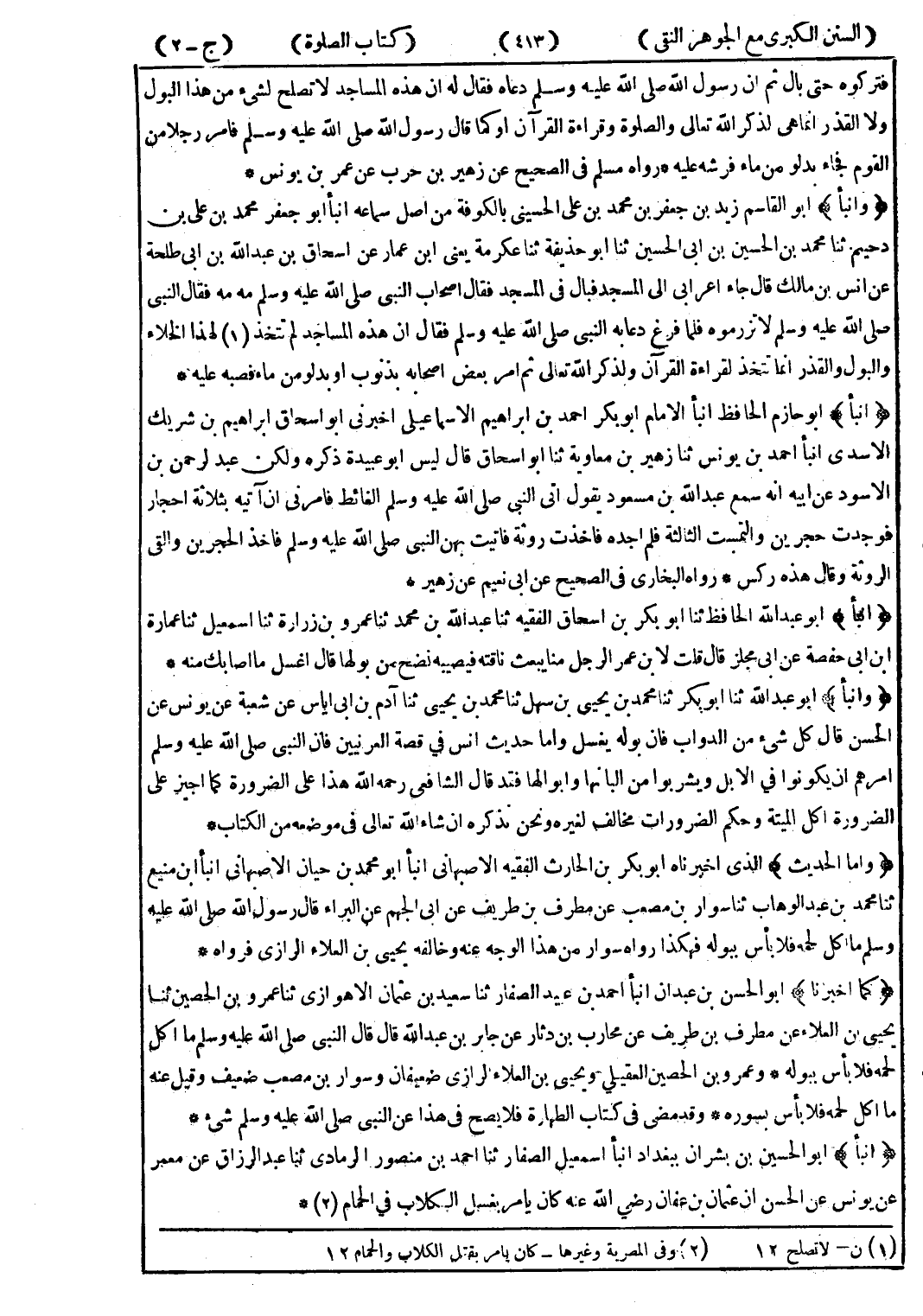 فتركوه حتى بال ثم ان رسول الله صلى الله عليه وسلم دعاه فقال له ان هذه المساجد لا تصلح لشئ من هذا البول ولا القذر انما هي لذكر الله تعالى والصلوة وقراءة القرآن أو كما قال رسول الله صلى الله عليه وسلم فامر رجلا من القوم فجاء بدلو من ماء فرشه عليه * رواه مسلم في الصحيح عن زهير بن حرب عن عمر بن يونس * (وانبأ) أبو القاسم زيد بن جعفر بن محمد بن على الحسينى بالكوفة من اصل سماعه انبأ أبو جعفر محمد بن على بن دحيم ثنا محمد بن الحسين بن ابى الحسين ثنا أبو حذيفة ثنا عكرمة يعنى ابن عمار عن اسحاق بن عبد الله بن ابى طلحة عن انس بن مالك قال جاء اعرابي إلى المسجد فبال في المسجد فقال اصحاب النبي صلى الله عليه وسلم مه مه فقال النبي صلى الله عليه وسلم لا تزرموه فلما فرغ دعا به النبي صلى الله عليه وسلم فقال ان هذه المساجد لم تتخذ (1) لهذا الخلاء والبول والقذر انما تتخذ لقراءة القرآن ولذكر الله تعالى ثم امر بعض اصحابه بذنوب أو بدلو من ماء فصبه عليه *