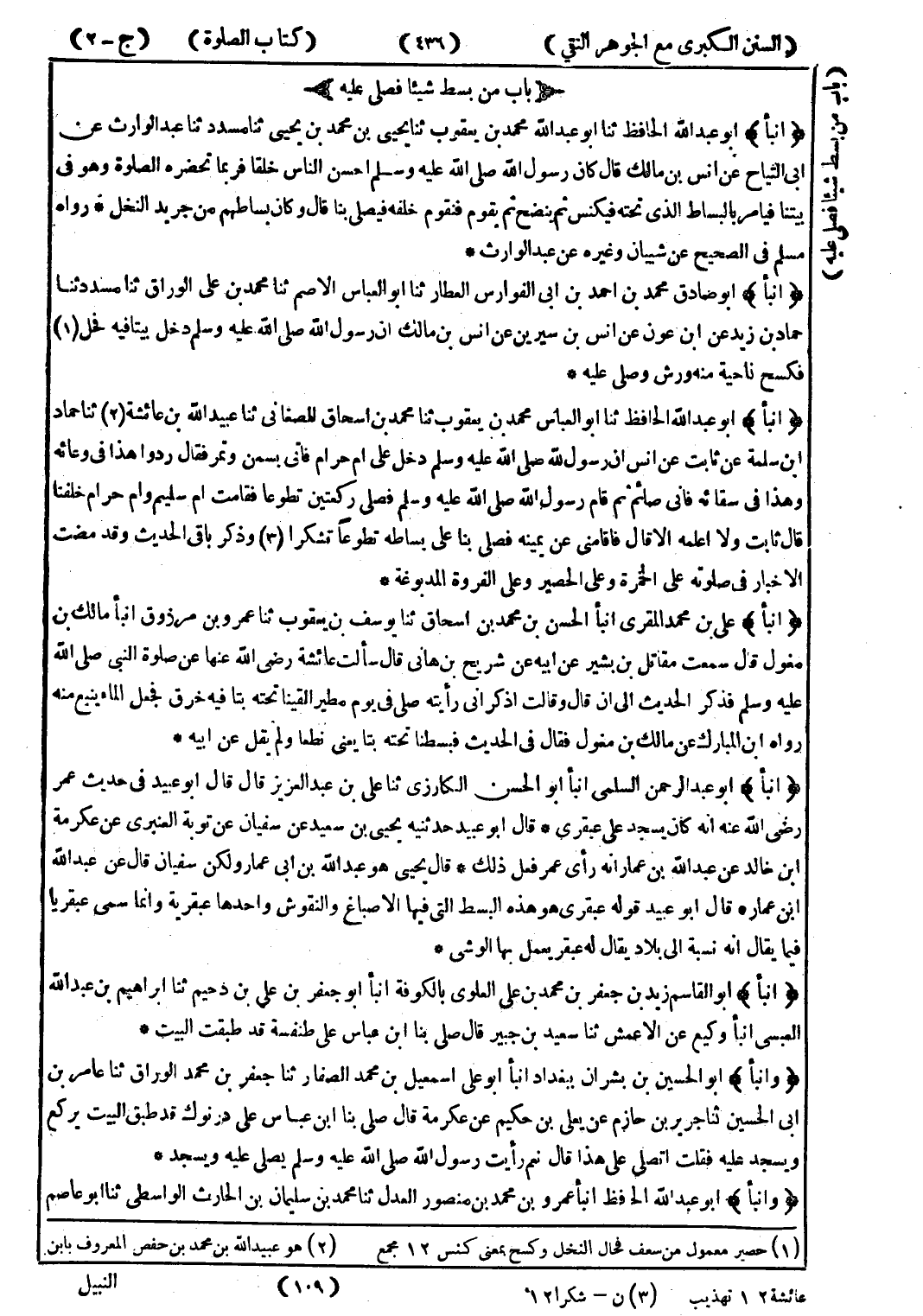 (أنبأ) أبو القاسم زيد بن جعفر بن محمد بن على العلوى بالكوفة انبأ أبو جعفر بن علي بن دحيم ثنا ابراهيم بن عبد الله العبسى انبأ وكيع عن الاعمش ثنا سعيد بن جبير قال صلى بنا ابن عباس على طنفسة قد طبقت البيت * (وانبأ) أبو الحسين بن بشران ببغداد انبأ أبو على اسمعيل بن محمد الصفار ثنا جعفر بن محمد الوراق ثنا عامر بن ابى الحسين ثنا جرير بن حازم عن يعلى بن حكيم عن عكرمة قال صلى بنا ابن عباس على درنوك قد طبق البيت يركع