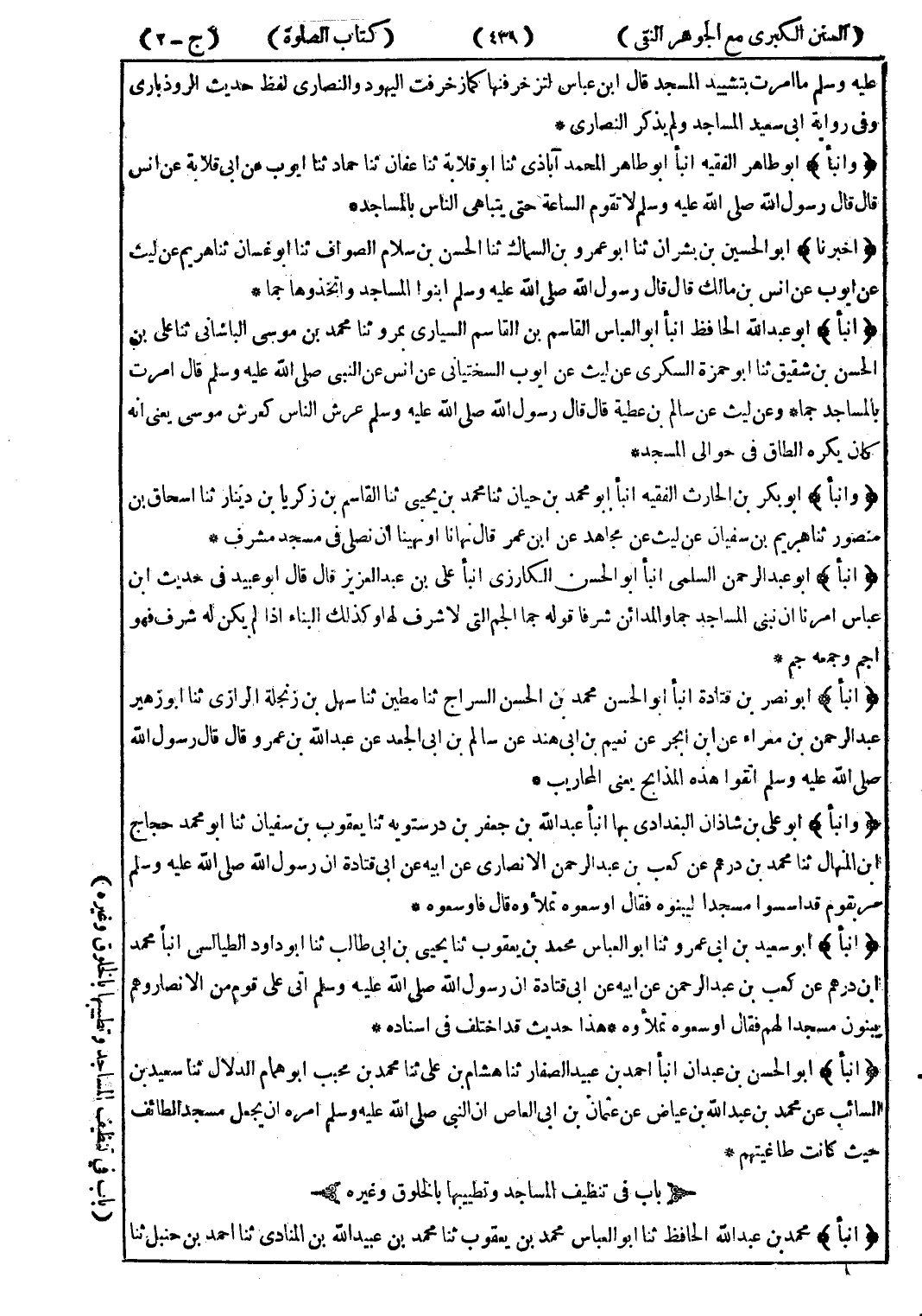 (أنبأ) أبو نصر بن قتادة انبأ أبو الحسن محمد بن الحسن السراج ثنا مطين ثنا سهل بن زنجلة الرازي ثنا أبو زهير عبد الرحمن بن معراء عن ابن ابجر عن نعيم بن ابى هند عن سالم بن ابى الجعد عن عبد الله بن عمرو قال قال رسول الله صلى الله عليه وسلم اتقوا هذه المذابح يعنى المحاريب * (وانبأ) أبو على بن شاذان البغدادي بها انبأ عبد الله بن جعفر بن درستويه ثنا يعقوب بن سفيان ثنا أبو محمد حجاج ابن المنهال ثنا محمد بن درهم عن كعب بن عبد الرحمن الانصاري عن ابيه عن ابى قتادة ان رسول الله صلى الله عليه وسلم مر بقوم قد اسسوا مسجدا ليبنوه فقال أو سعوه تملاوه قال فاوسعوه *