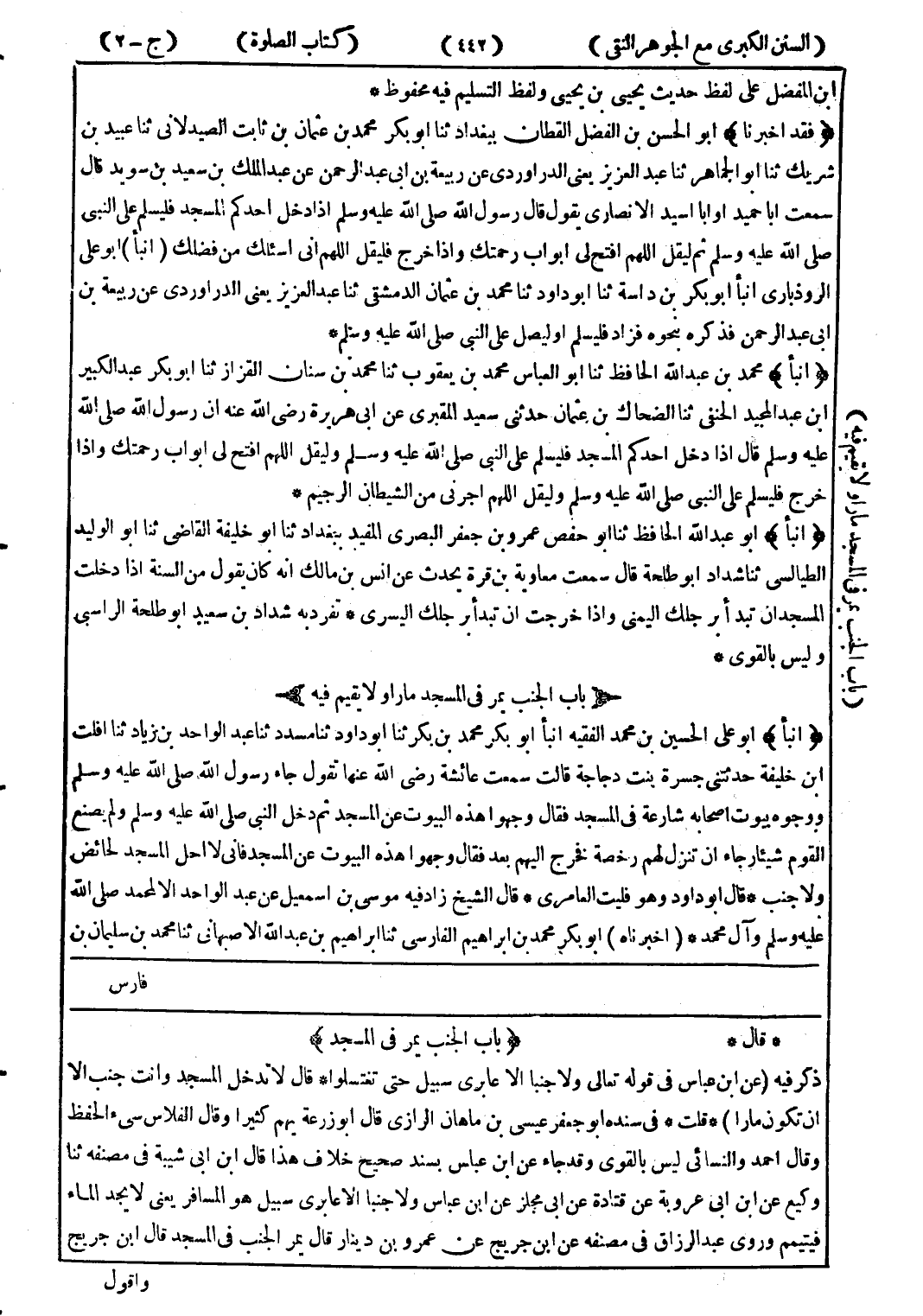 * قال * (باب الجنب يمر في المسجد) ذكر فيه (عن ابن عباس في قوله تعالى ولا جنبا الا عابرى سبيل حتى تغتسلوا * قال لا تدخل المسجد وانت جنب الا ان تكون مارا) * قلت * في سنده أبو جعفر عيسى بن ماهان الرازي قال أبو زرعة يهم كثيرا وقال الفلاس سئ الحفظ وقال احمد والنسائي ليس بالقوى وقد جاء عن ابن عباس بسند صحيح خلاف هذا قال ابن ابى شيبة في مصنفه ثنا وكيع عن ابن ابى عروبة عن قتادة عن ابى مجلز عن ابن عباس ولا جنبا الا عابرى سبيل هو المسافر يعنى لا يجد الماء فيتيمم وروى عبد الرزاق في مصنفه عن ابن جريج عن عمر وبن دينار قال يمر الجنب في المسجد قال ابن جريج