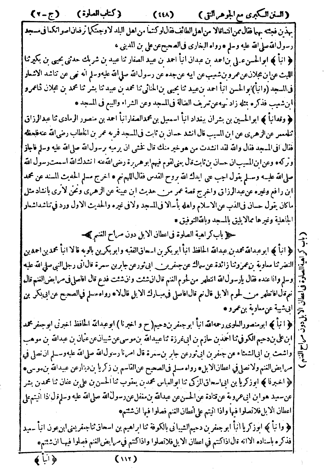 (أنبأ) أبو منصور العلوى رحمه الله انبأ أبو جعفر بن دحيم (ح واخبرنا) أبو عبد الله الحافظ اخبرني أبو جعفر محمد ابن على بن دحيم الكوفي ثنا احمد بن حازم بن ابى غرزة ثنا عبيد الله بن موسى عن شيبان عن عثمان بن عبد الله بن موهب واشعث بن ابى الشعثاء عن جعفر بن ابى ثور عن جابر بن سمرة قال امرنا رسول الله صلى الله عليه وسلم ان نصلى في مرابض الغنم ولا نصلى في اعطان الابل * رواه مسلم في الصحيح عن القاسم بن زكريا بن دينار عن عبيد الله بن موسى *