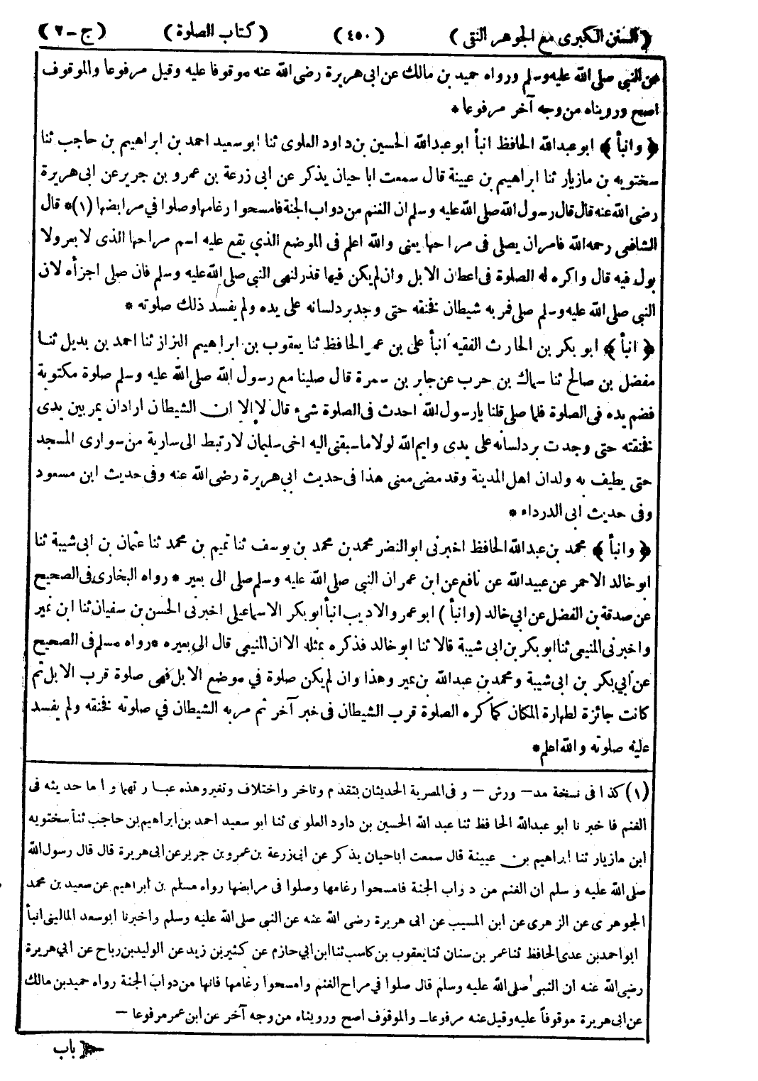 (1) كذا في نسخة مد ورش وفى المصرية الحديثان بتقدم وتاخر واختلاف وتغير وهذه عبارتهما واما حديثه في الغنم فاخبرنا أبو عبد الله الحافظ ثنا عبد الله الحسين بن داود نا أبو سعيد احمد بن ابراهيم بن حاجب بن سختويه ابن مازيار ثنا ابراهيم بن عيينة قال سمعت ابا حيان يذكر عن ابى زرعة بن عمرو بن جرير عن ابى هريرة قال قال رسول الله صلى الله عليه وسلم ان الغنم من دواب الجنة فامسحوا رغامها وصلوا في مرابضها رواه مسلم بن ابراهيم عن سعيد بن محمد الجوهرى عن الزهري عن ابن المسيب عن ابى هريرة رضى الله عنه عن النبي صلى الله عليه وسلم واخبرنا أبو سعيد المالينى أنبأ أبو احمد بن عدى الحافظ ثنا عمر بن سنان ثنا يعقوب بن كاسب ثنا ابن ابى حازم عن كثير بن زيد عن الوليد بن رباح عن ابى هريرة رضى الله عنه ان النبي صلى الله عليه وسلم قال صلوا في مراح الغنم وامسحوا رغامها فانها من دواب الجنة رواه حميد بن مالك عن ابى هريرة موقوفا عليه وقيل عنه مرفوعا والموقف اصح ورويناه من وجه آخر عن ابن عمر مرفوعا