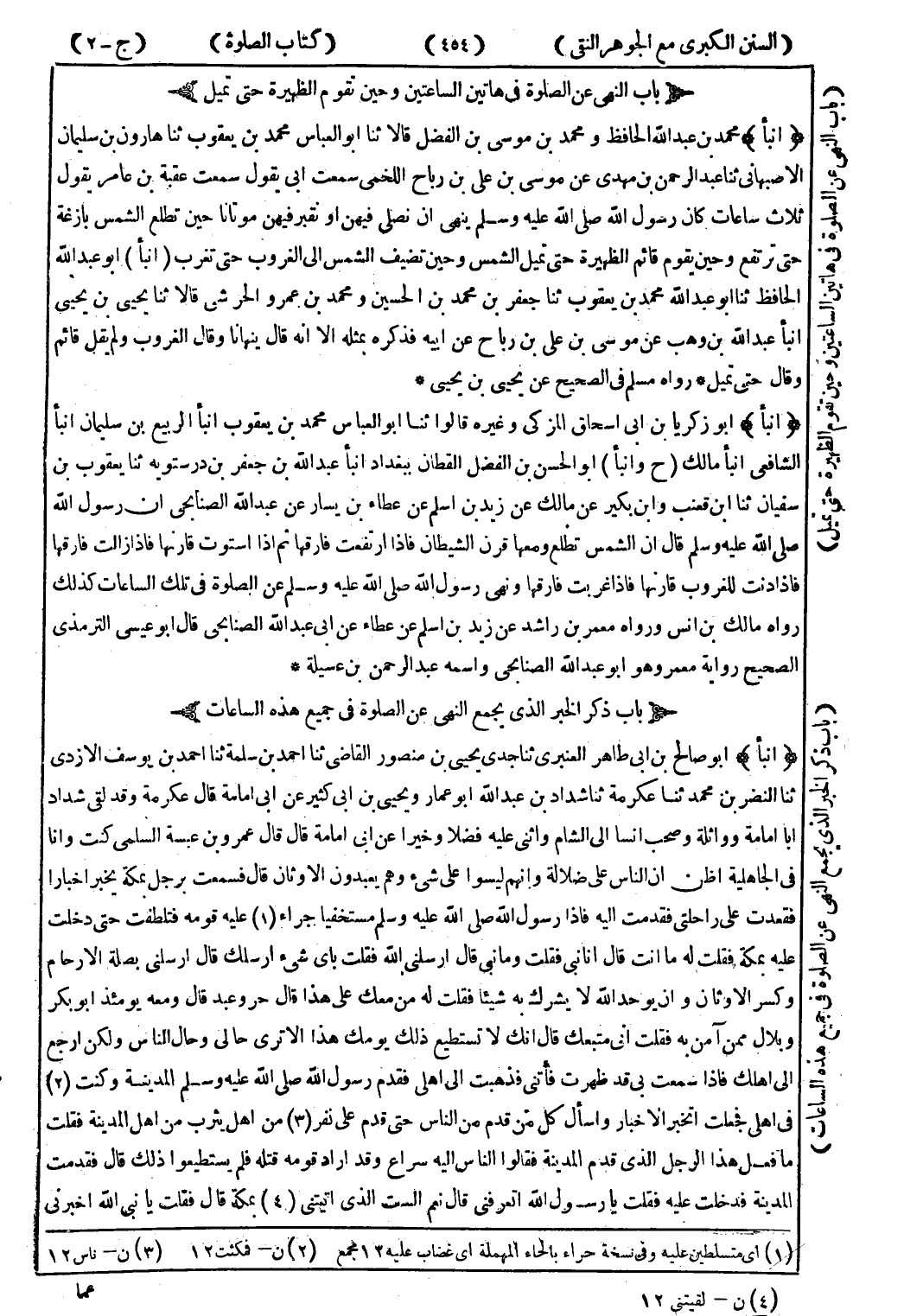 (أنبأ) محمد بن عبد الله الحافظ ومحمد بن موسى بن الفضل قالا ثنا أبو العباس محمد بن يعقوب ثنا هارون سليمان الاصبهاني ثنا عبد الرحمن بن مهدى عن موسى بن على بن رباح اللخمى سمعت ابى يقول سمعت عقبة بن عامر يقول ثلاث ساعات كان رسول الله صلى الله عليه وسلم ينهى ان نصلى فيهن أو نقبر فيهن موتانا حين تطلع الشمس بازغة حتى ترتفع وحين يقوم قائم الظهيرة حتى تميل الشمس وحين تضيف الشمس إلى الغروب حتى تغرب