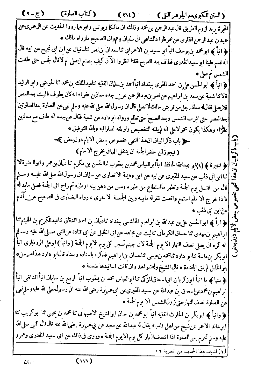 (أنبأ) أبو الحسن على بن عبد الله بن ابراهيم الهاشمي ببغداد ثنا عثمان بن احمد الدقاق ثنا عبد الكريم بن الهيثم ثنا ابراهيم بن مهدى ثنا حسان الكرماني ثنا ليث عن مجاهد عن ابى الخليلى عن ابى قتادة عن النبي صلى الله عليه وسلم انه كره ان يصلى نصف النهار الا يوم الجمعة لان جهنم تسجر كل يوم الا يوم الجمعة (وانبأ) أبو على الروذبارى انبأ أبو بكر بن داسة ثنا أبو داود ثنا محمد بن عيسى ثنا حسان بن ابراهيم فذكره باسناده ومعناه قال أبو داود هذا مرسل * أبو الخليل لم يلق ابا قتادة * قال الشيخ وله شواهد وان كانت اسانيدها ضعيفة * (منها) ما انبأ أبو زكريا بن ابى اسحاق المزكى ثنا أبو العباس محمد بن يعقوب انبأ الربيع بن سليمان انبأ الشافعي انبأ ابراهيم بن محمد عن اسحاق بن عبد الله عن سعيد المقبري عن ابى هريرة رضى الله عنه ان رسول الله صلى الله عليه وسلم نهى عن الصلوة نصف النهار حتى تزول الشمس الا يوم الجمعة * (وانبأ) أبو بكر بن الحارث الفقيه انبأ أبو محمد بن حيان أبو الشيخ الاصبهاني ثنا محمد بن يحيى ثنا أبو كريب ثنا أبو خالد الاحمر عن شيخ من اهل المدينة يقال له عبد الله عن سعيد عن ابي هريرة رضى الله عنه قال قال النبي صلى الله عليه وسلم تحرم يعنى الصلوة إذا انتصف النهار كل يوم الا يوم الجمعة * وروى في ذلك عن ابى سعيد الخدرى وعمرو