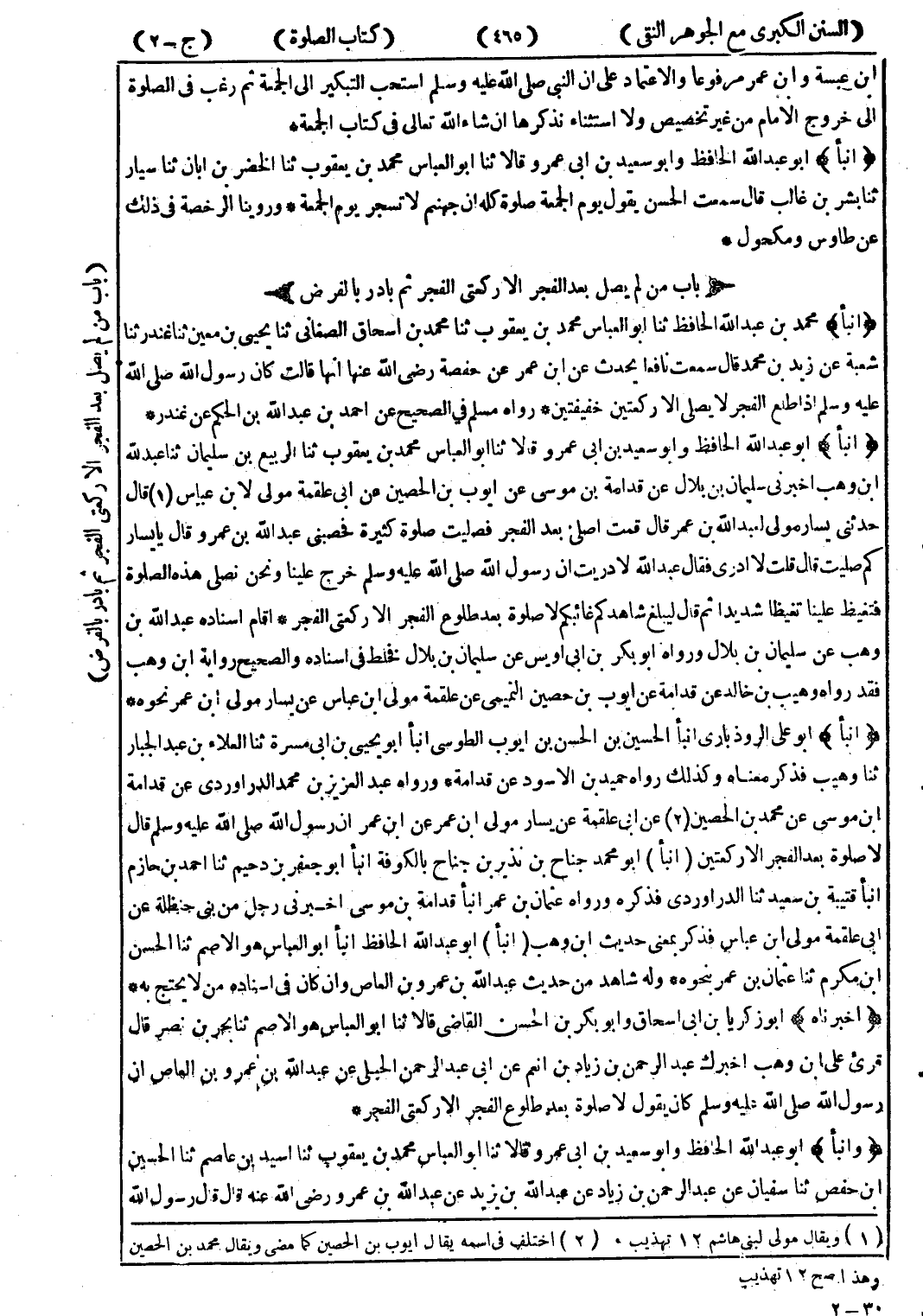 (أنبأ) أبو على الروذبارى انبأ الحسين بن الحسن بن ايوب الطوسى انبأ أبو يحيى بن ابى مسرة ثنا العلاء بن عبد الجبار ثنا وهيب فذكر معناه وكذلك رواه حميد بن الاسود عن قدامة * ورواه عبد العزيز بن محمد الدراوردى عن قدامة ابن موسى عن محمد بن الحصين (2) عن ابى علقمة عن يسار مولى ابن عمر عن ابن عمر ان رسول الله صلى الله عليه وسلم قال لا صلوة بعد الفجر الا ركعتين