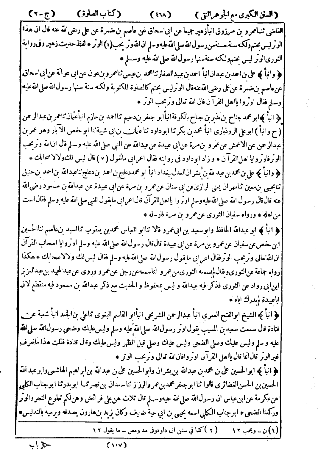 القاضى ثنا عمرو بن مرزوق انبأ زهير جميعا عن ابى اسحاق عن عاصم بن ضمرة عن على رضى الله عنه قال ان هذا الوتر ليس بحتم ولكنه سنة حسنة من رسول الله صلى الله عليه وسلم ان الله وتر يحب (1) الوتر * لفظ حديث زهير وفي رواية الثوري الوتر ليس بحتم ولكنه سنة سنها رسول الله صلى الله عليه وسلم * (وانبأ) على بن احمد بن عبدان انبأ احمد بن عبيد الصفار ثنا محمد بن عيسى ثنا عمرو بن عون عن ابى عوانة عن ابى اسحاق عن عاصم بن ضمرة عن على رضى الله عنه قال الوتر ليس بحتم كالصلوة المكتوبة ولكنه سنة سنها رسول الله صلى الله عليه وسلم فقال اوتروا يا اهل القرآن فان الله تعالى وتر يحب الوتر *