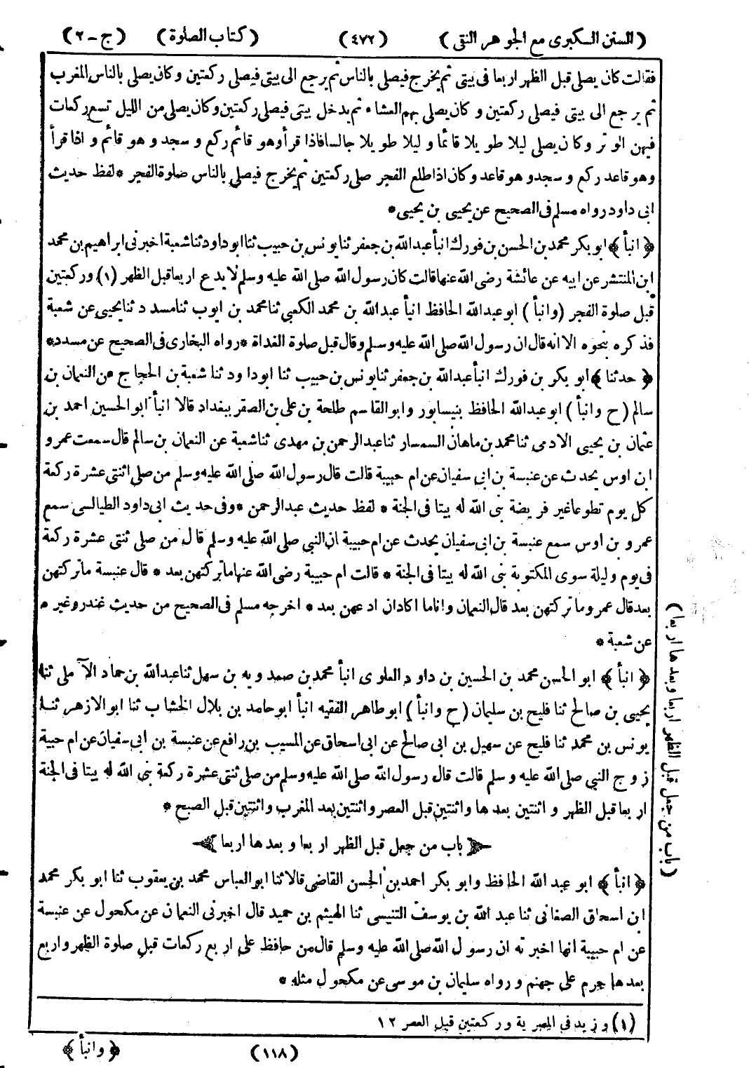 (أنبأ) أبو الحسن محمد بن الحسين بن داود العلوى انبأ محمد بن صمدويه بن سهل ثنا عبد الله بن حماد الآملي ثنا يحيى بن صالح ثنا فليح بن سليمان (ح وانبأ) أبو طاهر الفقيه انبأ أبو حامد بن بلال الخشاب ثنا أبو الازهر ثنا يونس بن محمد ثنا فليح عن سهيل بن ابى صالح عن ابى اسحاق عن المسيب بن رافع عن عنبسة بن ابى سفيان عن ام حبيبة زوج النبي صلى الله عليه وسلم قالت قال رسول الله صلى الله عليه وسلم من صلى ثنتى عشرة ركعة بنى الله له بيتا في الجنة اربعا قبل الظهر واثنتين بعدها واثنتين قبل العصر واثنتين بعد المغرب واثنتين قبل الصبح *
