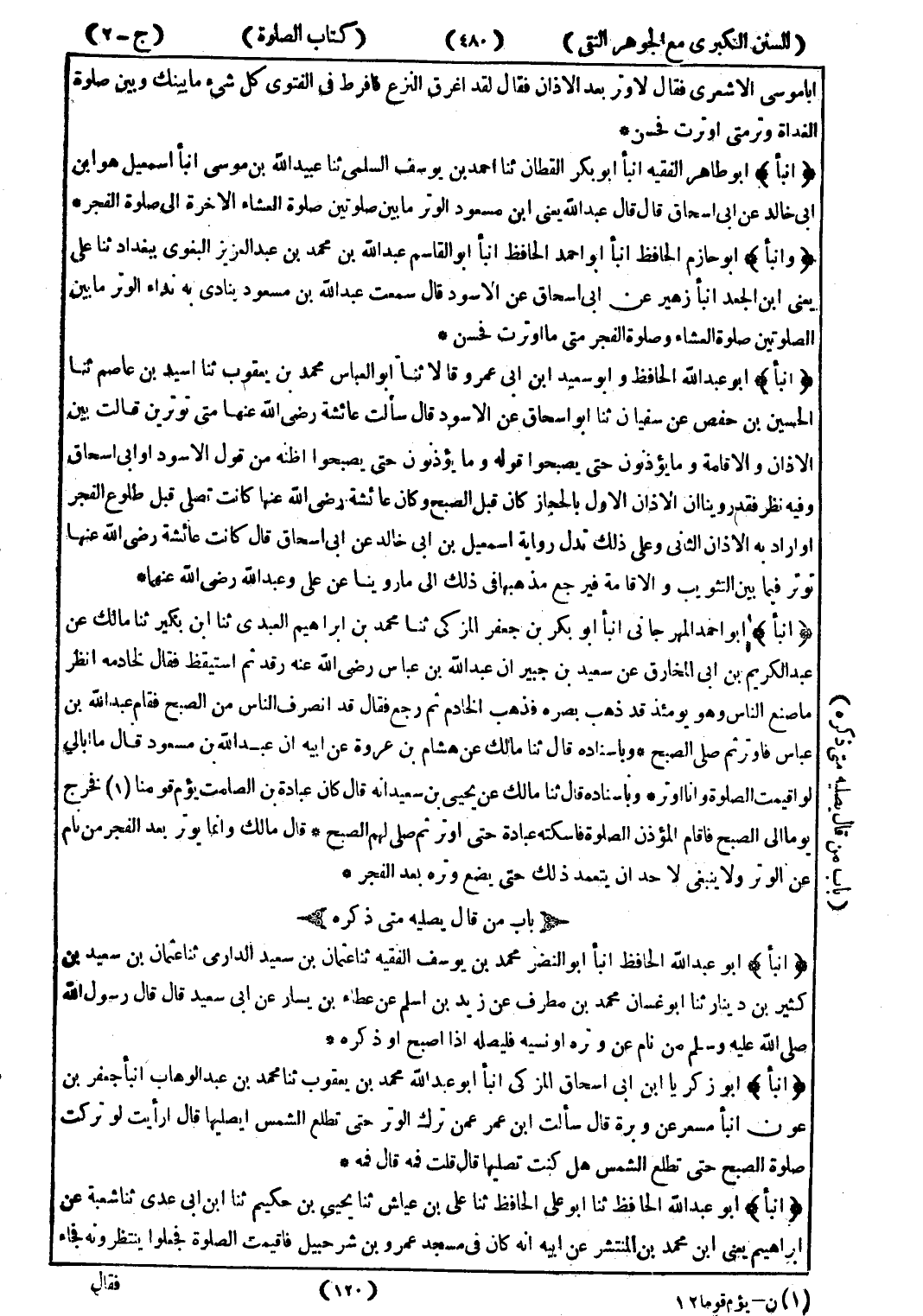 (أنبأ) أبو طاهر الفقيه انبأ أبو بكر القطان ثنا احمد بن يوسف السلمى ثنا عبيدالله بن موسى انبأ اسمعيل هو ابن ابى خالد عن ابى اسحاق قال قال عبد الله يعنى ابن مسعود الوتر ما بين صلوتين صلوة العشاء الاخرة إلى صلوة الفجر * (وانبأ) أبو حازم الحافظ انبأ أبو احمد الحافط انبأ أبو القاسم عبد الله بن محمد بن عبد العزيز البغوي ببغداد ثنا على