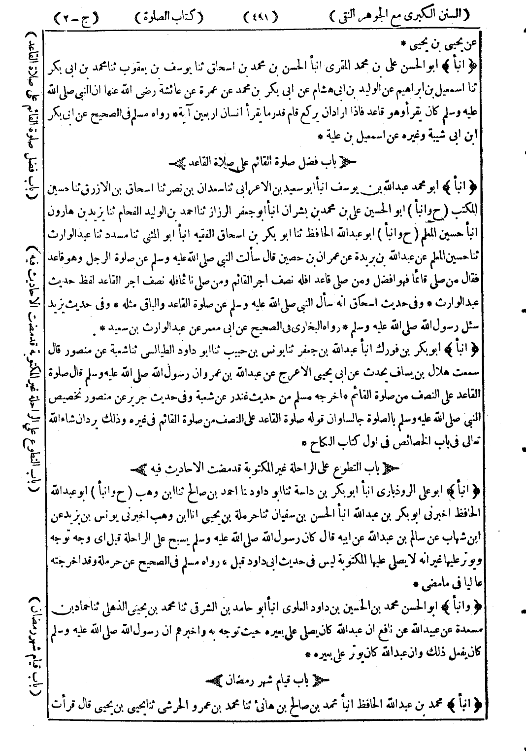 (أنبأ) أبو الحسن على بن محمد المقرى انبأ الحسن بن محمد بن اسحاق ثنا يوسف بن يعقوب ثنا محمد بن ابى بكر ثنا اسمعيل بن ابراهيم عن الوليد بن ابى هشام عن ابى بكر بن محمد عن عمرة عن عائشة رضى الله عنها ان النبي صلى الله عليه وسلم كان يقرأ وهو قاعد فإذا اراد ان يركع قام قدر ما يقرأ انسان اربعين آية * رواه مسلم في الصحيح عن ابى بكر ابن ابى شيبة وغيره عن اسمعيل بن علية *